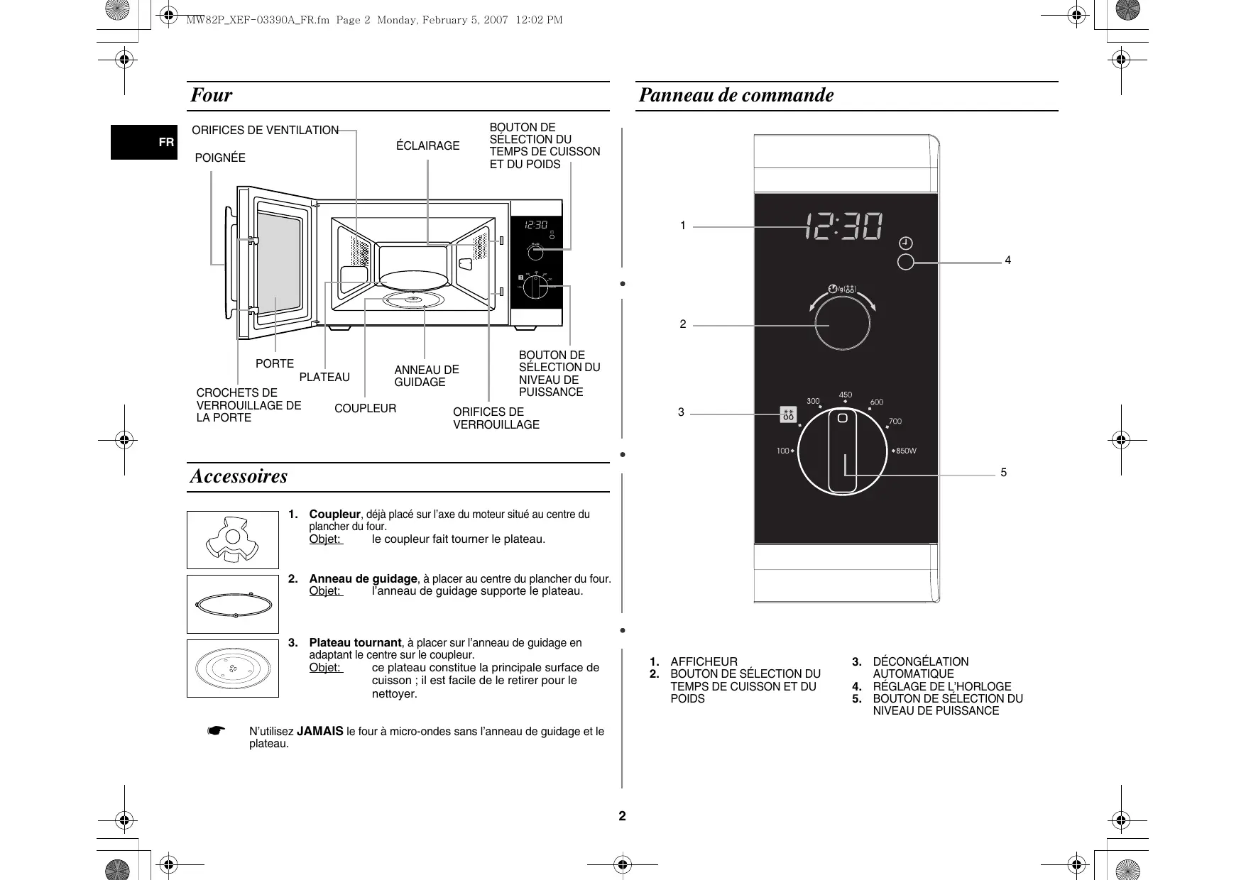 N'utilise JAMAIS le four à micro-ondes sans l'anneau de guidage et le plateau.