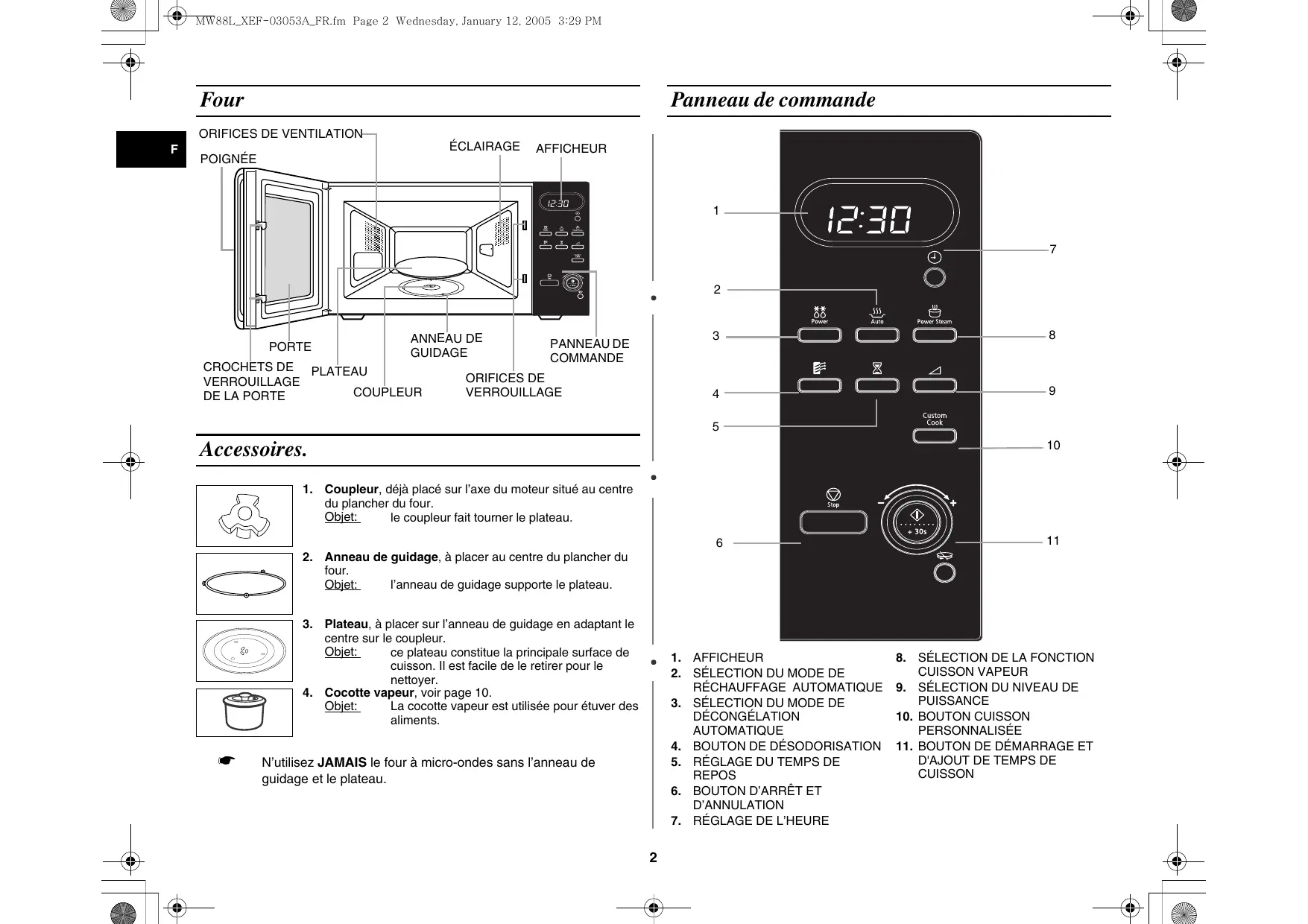 N’utilisez JAMAIS le four à micro-ondes sans l’anneau de guidage et le plateau.