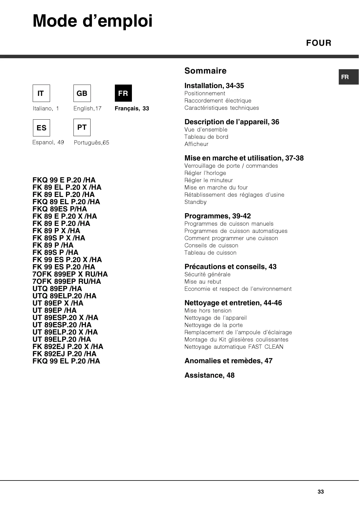 MODE D'EMPLOI UTQ89EPHAICES HOTPOINT