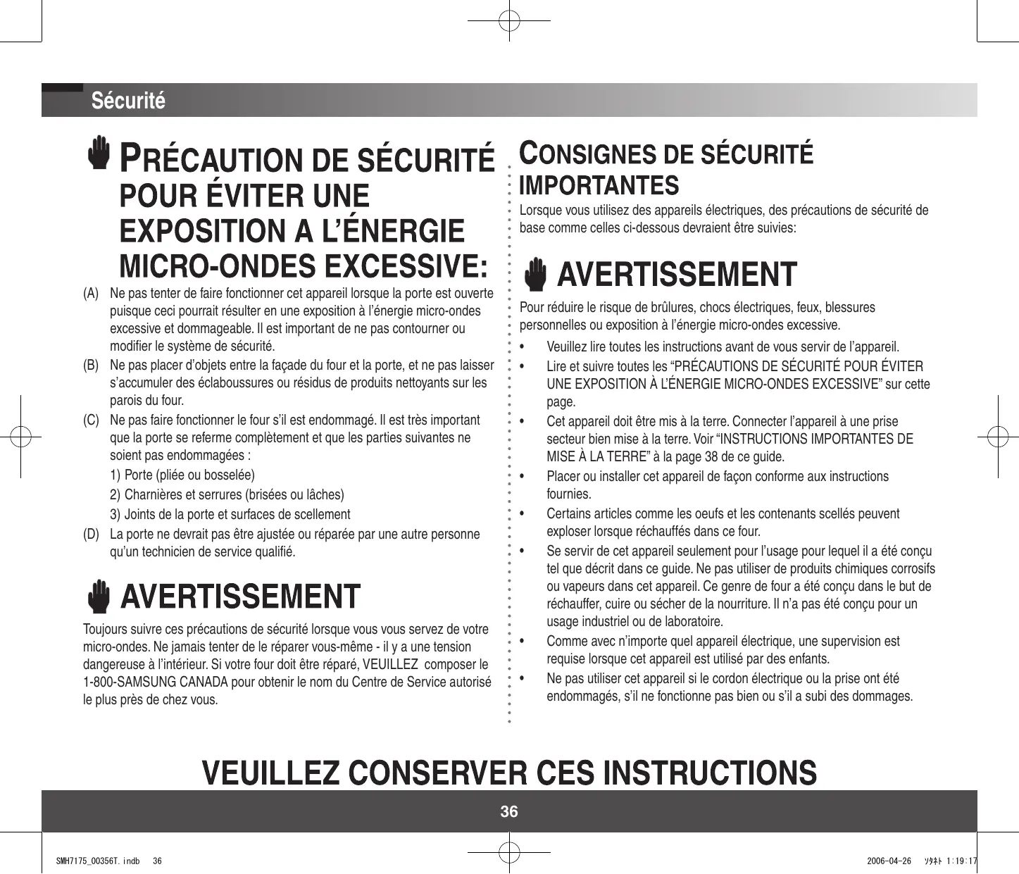 (D) La porte ne devrait pas être ajustée ou réparée par une autre personne qu’un technicien de service qualifié. Pour réduire le risque de brûlures, chocs électriques, feux, blessures personnelles ou exposition à l’énergie micro-ondes excessive. Veuillez lire toutes les instructions avant de vous servir de l’appareil. Lire et suivre toutes les “PRÉCAUTIONS DE SÉCURITÉ POUR ÉVITER UNE EXPOSITION À L’ÉNERGIE MICRO-ONDES EXCESSIVE” sur cette page. Cet appareil doit être mis à la terre. Connecter l’appareil à une prise secteur bien mise à la terre. Voir “INSTRUCTIONS IMPORTANTES DE MISE À LA TERRE” à la page 38 de ce guide. Placer ou installer cet appareil de façon conforme aux instructions fournies. Certains articles comme les oeufs et les contenants scellés peuvent exploser lorsque réchauffés dans ce four. Se servir de cet appareil seulement pour l’usage pour lequel il a été conçu tel que décrit dans ce guide. Ne pas utiliser de produits chimiques corrosifs ou vapeurs dans cet appareil. Ce genre de four a été conçu dans le but de réchauffer, cuire ou sécher de la nourriture. Il n’a pas été conçu pour un usage industriel ou de laboratoire. Comme avec n’importe quel appareil électrique, une supervision est requise lorsque cet appareil est utilisé par des enfants. Ne pas utiliser cet appareil si le cordon électrique ou la prise ont été endommagés, s’il ne fonctionne pas bien ou s’il a subi des dommages. Toujours suivre ces précautions de sécurité lorsque vous vous servez de votre micro-ondes. Ne jamais tenter de le réparer vous-même - il y a une tension dangereuse à l’intérieur. Si votre four doit être réparé, VEUILLEZ composer le 1-800-SAMSUNG CANADA pour obtenir le nom du Centre de Service autorisé le plus près de chez vous.