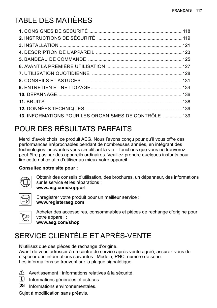 Merci d’avoir choisi ce produit AEG. Nous l’avons conçu pour qu’il vous offre des performances irréprochables pendant de nombreuses années, en intégrant des technologies innovantes vous simplifiant la vie – fonctions que vous ne trouverez peut-être pas sur des appareils ordinaires. Veuillez prendre quelques instants pour lire cette notice afin d’utiliser au mieux votre appareil. Consultez notre site pour : Obtenir des conseils d’utilisation, des brochures, un dépanneur, des informations sur le service et les réparations : www.aeg.com/support Enregistrer votre produit pour un meilleur service : www.registeraeg.com Acheter des accessoires, consommables et pièces de rechange d’origine pour votre appareil : www.aeg.com/shop