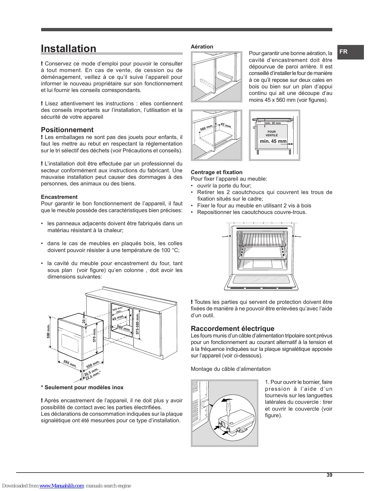! L’installation doit être effectuée par un professionnel du secteur conformément aux instructions du fabricant. Une mauvaise installation peut causer des dommages à des personnes, des animaux ou des biens. Encastrement Pour garantir le bon fonctionnement de l’appareil, il faut que le meuble possède des caractéristiques bien précises: