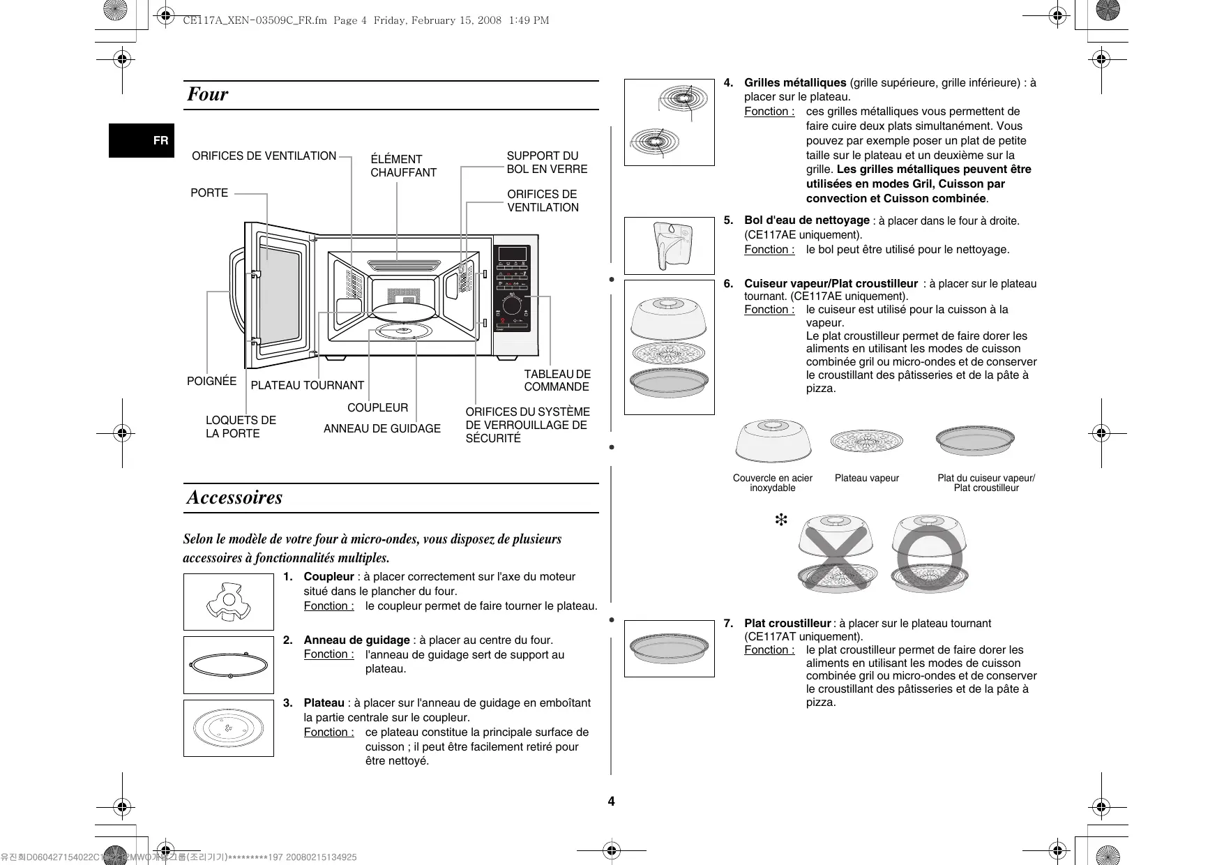 (CE117AT uniquement). Fonction : le plat croustilleur permet de faire dorer les aliments en utilisant les modes de cuisson combinée gril ou micro-ondes et de conserver le croustillant des pâtisseries et de la pâte à pizza.