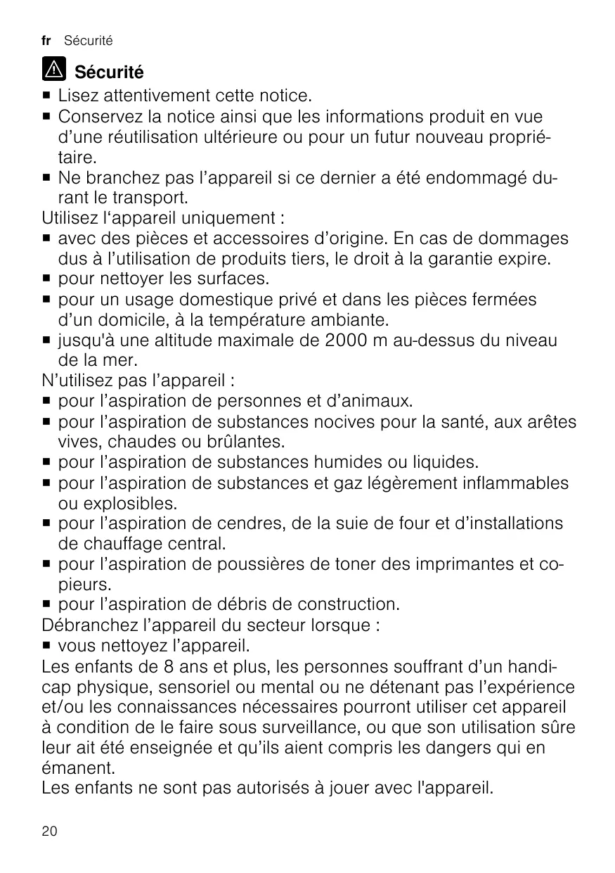 ¡ Lisez attentivement cette notice. ¡ Conservez la notice ainsi que les informations produit en vue d’une réutilisation ultérieure ou pour un futur nouveau propriétaire. ¡ Ne branchez pas l’appareil si ce dernier a été endommagé durant le transport. Utilisez l‘appareil uniquement : ¡ avec des pièces et accessoires d’origine. En cas de dommages dus à l’utilisation de produits tiers, le droit à la garantie expire. ¡ pour nettoyer les surfaces. ¡ pour un usage domestique privé et dans les pièces fermées d’un domicile, à la température ambiante. ¡ jusqu'à une altitude maximale de 2000 m au-dessus du niveau de la mer. N’utilisez pas l’appareil : ¡ pour l’aspiration de personnes et d’animaux. ¡ pour l’aspiration de substances nocives pour la santé, aux arêtes vives, chaudes ou brûlantes. ¡ pour l’aspiration de substances humides ou liquides. ¡ pour l’aspiration de substances et gaz légèrement inflammables ou explosibles. ¡ pour l’aspiration de cendres, de la suie de four et d’installations de chauffage central. ¡ pour l’aspiration de poussières de toner des imprimantes et copieurs. ¡ pour l’aspiration de débris de construction. Débranchez l’appareil du secteur lorsque : ¡ vous nettoyez l’appareil. Les enfants de 8 ans et plus, les personnes souffrant d’un handicap physique, sensoriel ou mental ou ne détenant pas l’expérience et/ou les connaissances nécessaires pourront utiliser cet appareil à condition de le faire sous surveillance, ou que son utilisation sûre leur ait été enseignée et qu’ils aient compris les dangers qui en émanent. Les enfants ne sont pas autorisés à jouer avec l'appareil. 20