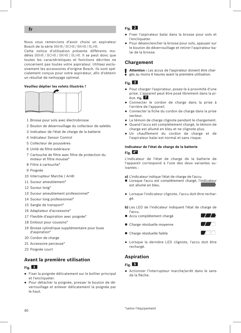fr Nous vous remercions d'avoir choisi un aspirateur Bosch de la série BBH8 / BCH8 / BKH8 / BLH8. Cette notice d'utilisation présente différents modèles BBH8 / BCH8 / BKH8 / BLH8. Il se peut donc que toutes les caractéristiques et fonctions décrites ne concernent pas toutes votre aspirateur. Utilisez exclusivement les accessoires d'origine Bosch. Ils sont spécialement conçus pour votre aspirateur, afin d'obtenir un résultat de nettoyage optimal.
