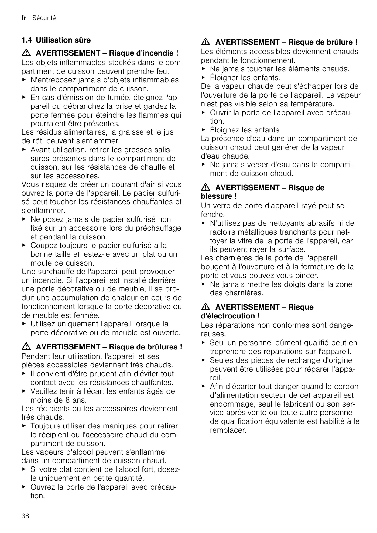 1.4 Utilisation sûre AVERTISSEMENT ‒ Risque d'incendie ! Les objets inflammables stockés dans le compartiment de cuisson peuvent prendre feu. ▶ N'entreposez jamais d'objets inflammables dans le compartiment de cuisson. ▶ En cas d'émission de fumée, éteignez l'appareil ou débranchez la prise et gardez la porte fermée pour éteindre les flammes qui pourraient être présentes. Les résidus alimentaires, la graisse et le jus de rôti peuvent s'enflammer. ▶ Avant utilisation, retirer les grosses salissures présentes dans le compartiment de cuisson, sur les résistances de chauffe et sur les accessoires. Vous risquez de créer un courant d'air si vous ouvrez la porte de l'appareil. Le papier sulfurisé peut toucher les résistances chauffantes et s'enflammer. ▶ Ne posez jamais de papier sulfurisé non fixé sur un accessoire lors du préchauffage et pendant la cuisson. ▶ Coupez toujours le papier sulfurisé à la bonne taille et lestez-le avec un plat ou un moule de cuisson. Une surchauffe de l'appareil peut provoquer un incendie. Si l’appareil est installé derrière une porte décorative ou de meuble, il se produit une accumulation de chaleur en cours de fonctionnement lorsque la porte décorative ou de meuble est fermée. ▶ Utilisez uniquement l'appareil lorsque la porte décorative ou de meuble est ouverte. AVERTISSEMENT ‒ Risque de brûlures ! Pendant leur utilisation, l'appareil et ses pièces accessibles deviennent très chauds. ▶ Il convient d'être prudent afin d'éviter tout contact avec les résistances chauffantes. ▶ Veuillez tenir à l'écart les enfants âgés de moins de 8 ans. Les récipients ou les accessoires deviennent très chauds. ▶ Toujours utiliser des maniques pour retirer le récipient ou l'accessoire chaud du compartiment de cuisson. Les vapeurs d'alcool peuvent s'enflammer dans un compartiment de cuisson chaud. ▶ Si votre plat contient de l'alcool fort, dosezle uniquement en petite quantité. ▶ Ouvrez la porte de l'appareil avec précaution. 38