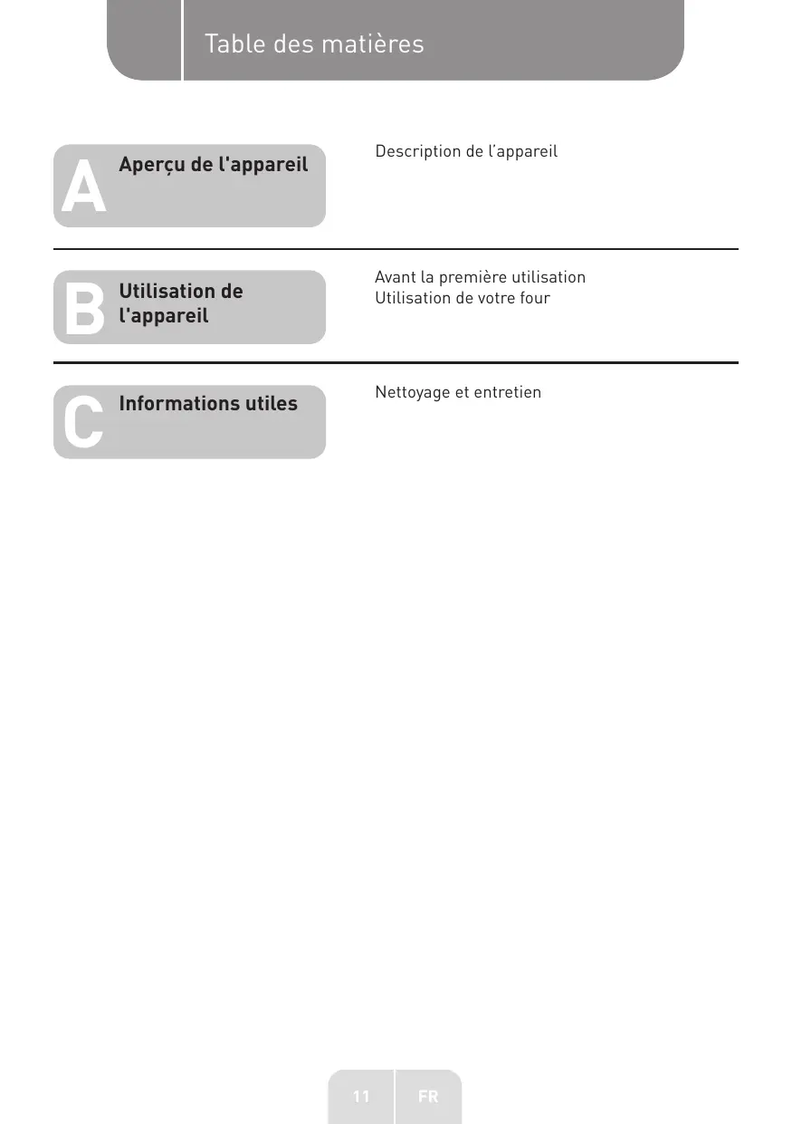 Aperçu Table des dematières l’appareil Description de l’appareil Aperçu de l'appareil Avant la première utilisation Utilisation de votre four Utilisation de l'appareil Nettoyage et entretien Informations utiles