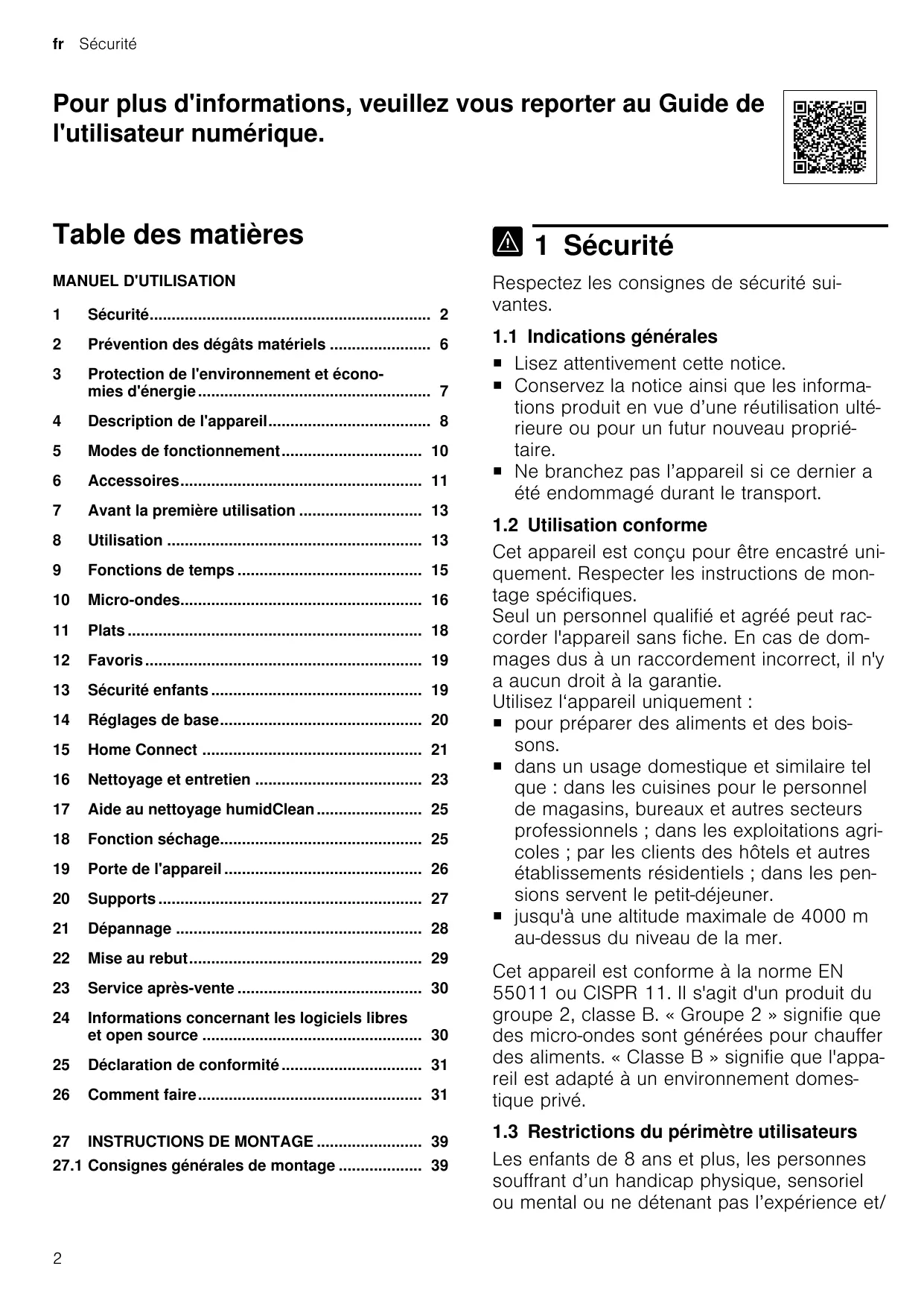 1 Sécurité Respectez les consignes de sécurité suivantes. 1.1 Indications générales ¡ Lisez attentivement cette notice. ¡ Conservez la notice ainsi que les informations produit en vue d’une réutilisation ultérieure ou pour un futur nouveau propriétaire. ¡ Ne branchez pas l’appareil si ce dernier a été endommagé durant le transport. 1.2 Utilisation conforme Cet appareil est conçu pour être encastré uniquement. Respecter les instructions de montage spécifiques. Seul un personnel qualifié et agréé peut raccorder l'appareil sans fiche. En cas de dommages dus à un raccordement incorrect, il n'y a aucun droit à la garantie. Utilisez l‘appareil uniquement : ¡ pour préparer des aliments et des boissons. ¡ dans un usage domestique et similaire tel que : dans les cuisines pour le personnel de magasins, bureaux et autres secteurs professionnels ; dans les exploitations agricoles ; par les clients des hôtels et autres établissements résidentiels ; dans les pensions servent le petit-déjeuner. ¡ jusqu'à une altitude maximale de 4000 m au-dessus du niveau de la mer. Cet appareil est conforme à la norme EN 55011 ou CISPR 11. Il s'agit d'un produit du groupe 2, classe B. « Groupe 2 » signifie que des micro-ondes sont générées pour chauffer des aliments. « Classe B » signifie que l'appareil est adapté à un environnement domestique privé. 1.3 Restrictions du périmètre utilisateurs Les enfants de 8 ans et plus, les personnes souffrant d’un handicap physique, sensoriel ou mental ou ne détenant pas l’expérience et/