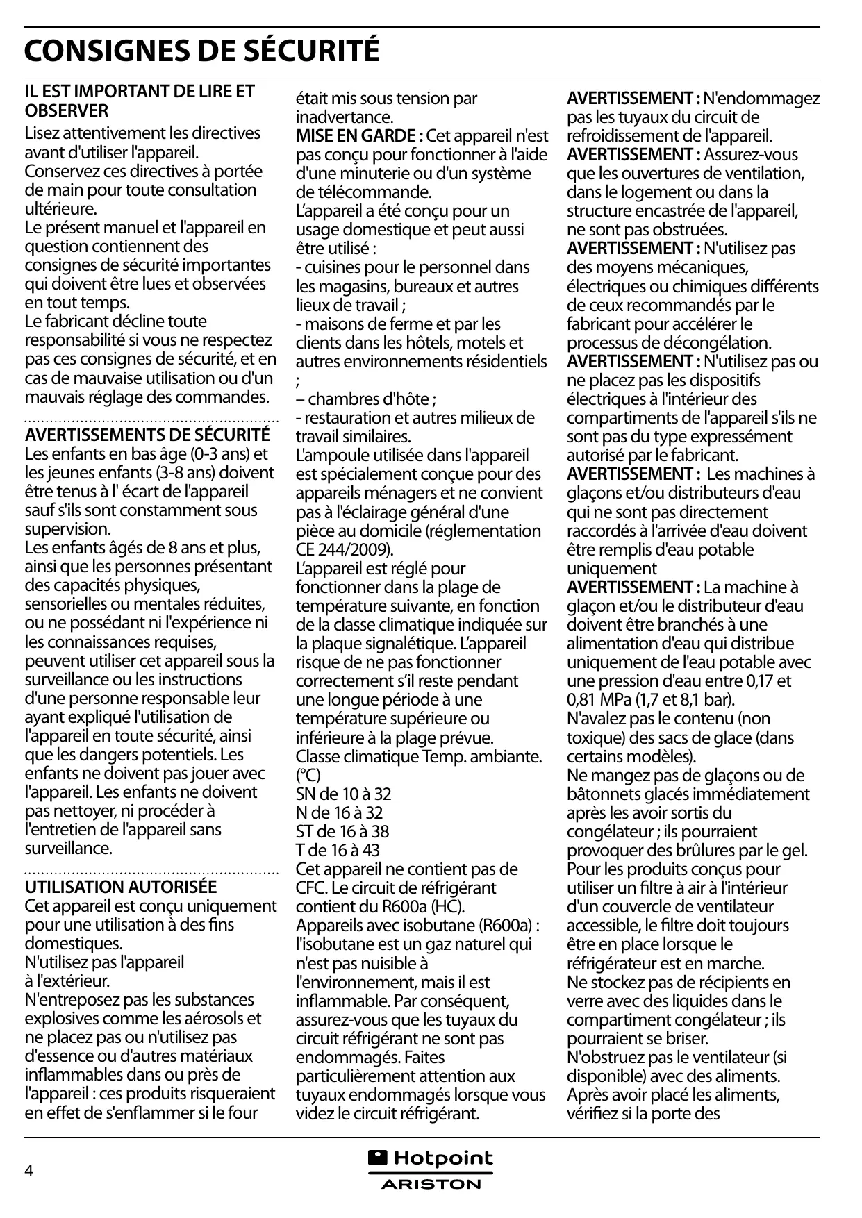 H8 A1E S - Réfrigérateur HOTPOINT - Notice d'utilisation et mode d'emploi gratuit