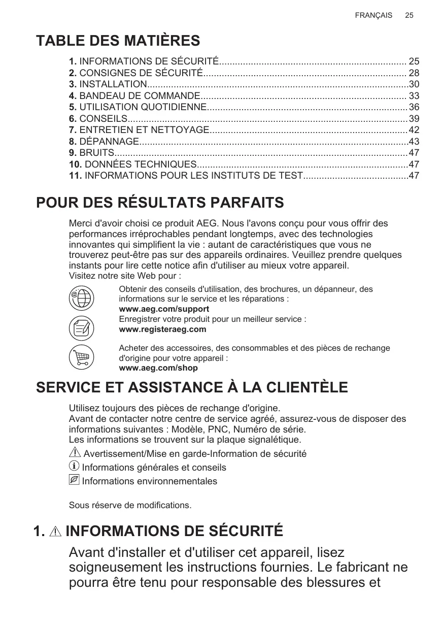 Merci d'avoir choisi ce produit AEG. Nous l'avons conçu pour vous offrir des performances irréprochables pendant longtemps, avec des technologies innovantes qui simplifient la vie : autant de caractéristiques que vous ne trouverez peut-être pas sur des appareils ordinaires. Veuillez prendre quelques instants pour lire cette notice afin d'utiliser au mieux votre appareil. Visitez notre site Web pour : Obtenir des conseils d'utilisation, des brochures, un dépanneur, des informations sur le service et les réparations : www.aeg.com/support Enregistrer votre produit pour un meilleur service : www.registeraeg.com LHNonBRwN = Acheter des accessoires, des consommables et des pièces de rechange d'origine pour votre appareil : www.aeg.com/shop