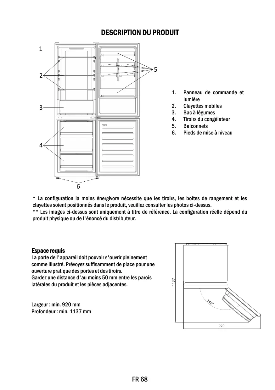 Panneau de commande et lumière Clayettes mobiles Bac à légumes Tiroirs du congélateur Balconnets Pieds de mise à niveau