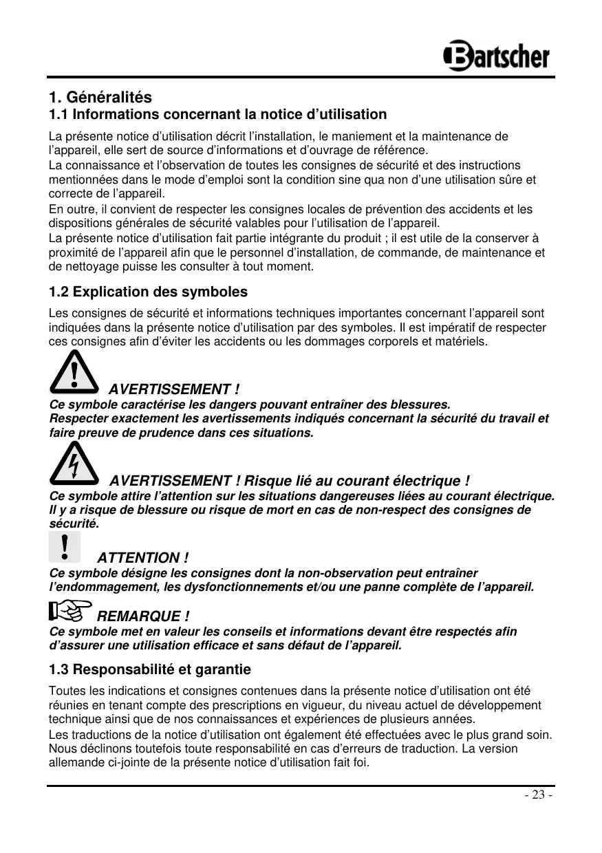 AVERTISSEMENT ! Afin d’exclure l’abus et les risques encourus, rendre l’appareil usagé inutilisable avant son élimination. Débrancher pour cela l’appareil de l’alimentation secteur et retirer le câble d’alimentation de l’appareil. REMARQUE ! Pour l’élimination de l’appareil, veuillez respecter les prescriptions en vigueur dans votre pays et votre commune. Bartscher GmbH Franz-Kleine-Straße 28 D-33154 Salzkotten Germany