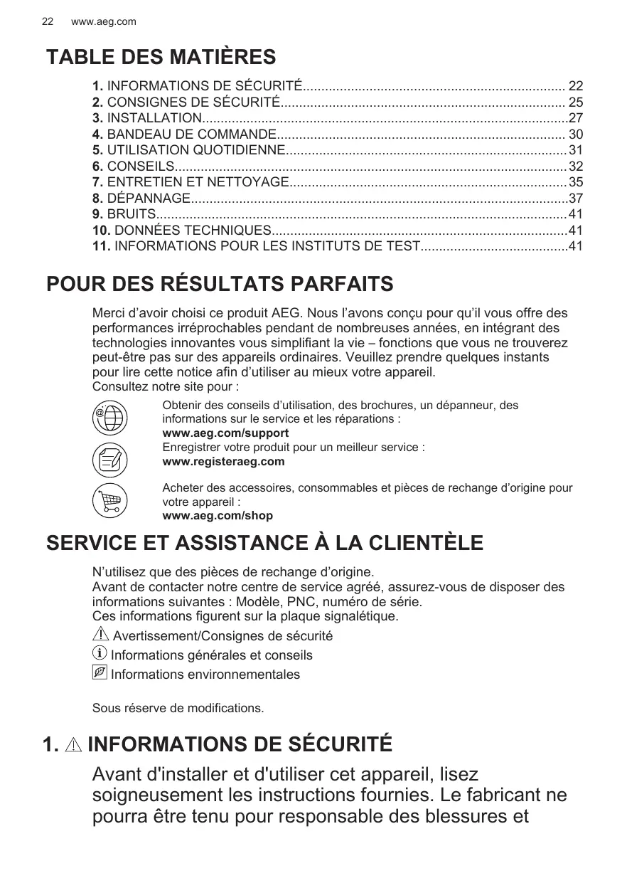 Merci d’avoir choisi ce produit AEG. Nous l’avons conçu pour qu’il vous offre des performances irréprochables pendant de nombreuses années, en intégrant des technologies innovantes vous simplifiant la vie – fonctions que vous ne trouverez peut-être pas sur des appareils ordinaires. Veuillez prendre quelques instants pour lire cette notice afin d’utiliser au mieux votre appareil. Consultez notre site pour : Obtenir des conseils d’utilisation, des brochures, un dépanneur, des informations sur le service et les réparations : www.aeg.com/support Enregistrer votre produit pour un meilleur service : www.registeraeg.com Acheter des accessoires, consommables et pièces de rechange d’origine pour votre appareil : www.aeg.com/shop