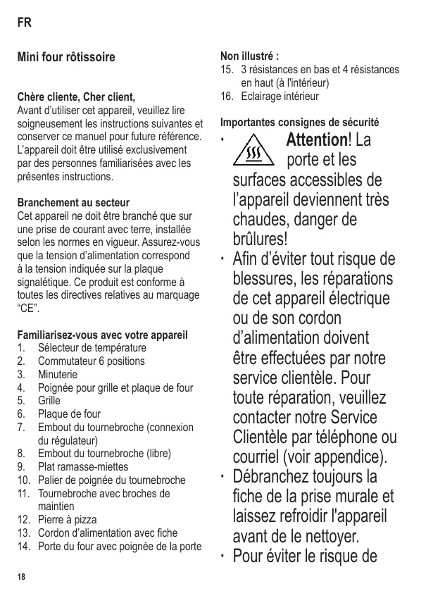 Chère cliente, Cher client, Avant d’utiliser cet appareil, veuillez lire soigneusement les instructions suivantes et conserver ce manuel pour future référence. L’appareil doit être utilisé exclusivement par des personnes familiarisées avec les présentes instructions. Branchement au secteur Cet appareil ne doit être branché que sur une prise de courant avec terre, installée selon les normes en vigueur. Assurez-vous que la tension d’alimentation correspond à la tension indiquée sur la plaque signalétique. Ce produit est conforme à toutes les directives relatives au marquage “CE”. Familiarisez-vous avec votre appareil 1. Sélecteur de température 2. Commutateur 6 positions 3. Minuterie 4. Poignée pour grille et plaque de four 5. Grille 6. Plaque de four 7. Embout du tournebroche (connexion du régulateur) 8. Embout du tournebroche (libre) 9. Plat ramasse-miettes 10. Palier de poignée du tournebroche 11. Tournebroche avec broches de maintien 12. Pierre à pizza 13. Cordon d’alimentation avec fiche 14. Porte du four avec poignée de la porte 18