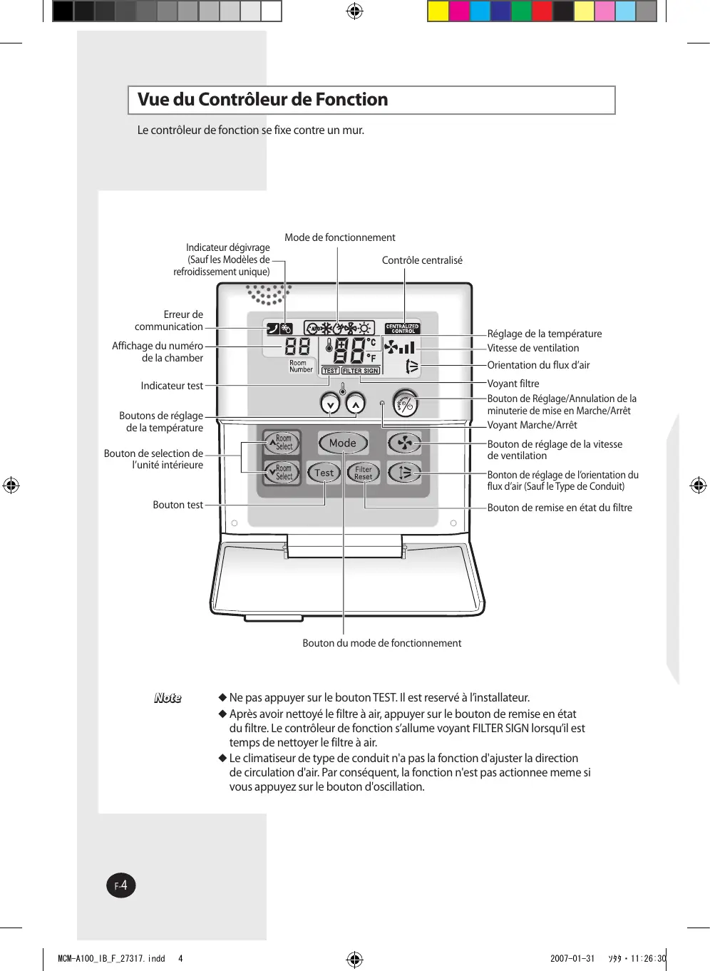 2007-01-31 ソタタ・11:26:30 Vue du Contrôleur de Fonction Le contrôleur de fonction se fixe contre un mur. Indicateur dégivrage (Sauf les Modèles de refroidissement unique) Mode de fonctionnement Contrôle centralisé Erreur de communication Réglage de la température Vitesse de ventilation Affichage du numéro de la chamber Orientation du flux d’air Voyant filtre Bouton de Réglage/Annulation de la minuterie de mise en Marche/Arrêt Voyant Marche/Arrêt Indicateur test Boutons de réglage de la température Bouton de réglage de la vitesse de ventilation Bouton de selection de l’unité intérieure Bonton de réglage de l’orientation du flux d’air (Sauf le Type de Conduit) Bouton test Bouton de remise en état du filtre Bouton du mode de fonctionnement Note Ne pas appuyer sur le bouton TEST. Il est reservé à l’installateur. Après avoir nettoyé le filtre à air, appuyer sur le bouton de remise en état du filtre. Le contrôleur de fonction s’allume voyant FILTER SIGN lorsqu’il est temps de nettoyer le filtre à air. Le climatiseur de type de conduit n'a pas la fonction d'ajuster la direction de circulation d'air. Par conséquent, la fonction n'est pas actionnee meme si vous appuyez sur le bouton d'oscillation. F-4 MCM-A100_IB_F_27317.indd