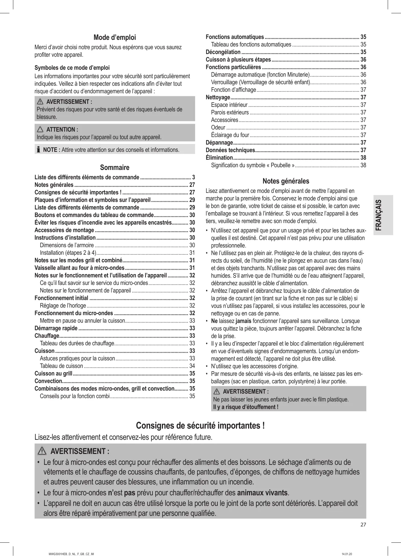 - Notes sur les modes grill et combiné p. 31
