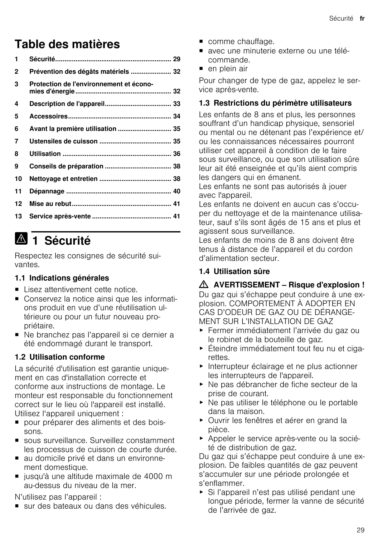 1 Sécurité 29 2 Prévention des dégâts matériels 32 3 Protection de l'environnement et économies d'énergie 32 4 Description de l'appareil 33 5 Accessoires 34 6 Avant la première utilisation 35 7 Ustensiles de cuisson 35 8 Utilisation 36 9 Conseils de préparation 38 10 Nettoyage et entretien 38 11 Dépannage 40 12 Mise au rebut 41 13 Service après-vente 41