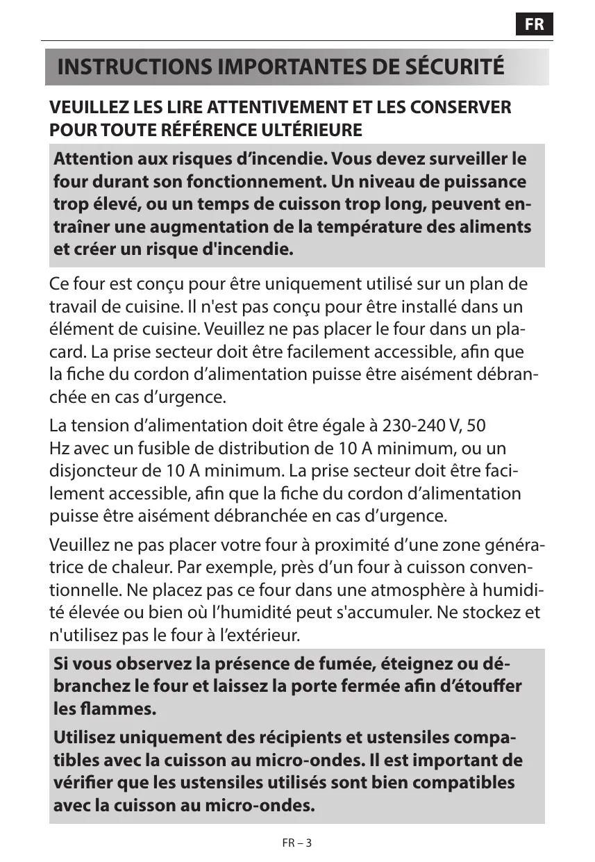 VEUILLEZ LES LIRE ATTENTIVEMENT ET LES CONSERVER POUR TOUTE RÉFÉRENCE ULTÉRIEURE Attention aux risques d’incendie. Vous devez surveiller le four durant son fonctionnement. Un niveau de puissance trop élevé, ou un temps de cuisson trop long, peuvent entraîner une augmentation de la température des aliments et créer un risque d'incendie. Ce four est conçu pour être uniquement utilisé sur un plan de travail de cuisine. Il n'est pas conçu pour être installé dans un élément de cuisine. Veuillez ne pas placer le four dans un placard. La prise secteur doit être facilement accessible, afin que la fiche du cordon d’alimentation puisse être aisément débranchée en cas d’urgence. La tension d’alimentation doit être égale à 230-240 V, 50 Hz avec un fusible de distribution de 10 A minimum, ou un disjoncteur de 10 A minimum. La prise secteur doit être facilement accessible, afin que la fiche du cordon d’alimentation puisse être aisément débranchée en cas d’urgence. Veuillez ne pas placer votre four à proximité d’une zone génératrice de chaleur. Par exemple, près d’un four à cuisson conventionnelle. Ne placez pas ce four dans une atmosphère à humidité élevée ou bien où l’humidité peut s'accumuler. Ne stockez et n'utilisez pas le four à l’extérieur. Si vous observez la présence de fumée, éteignez ou débranchez le four et laissez la porte fermée afin d’étouffer les flammes. Utilisez uniquement des récipients et ustensiles compatibles avec la cuisson au micro-ondes. Il est important de vérifier que les ustensiles utilisés sont bien compatibles avec la cuisson au micro-ondes. FR – 3