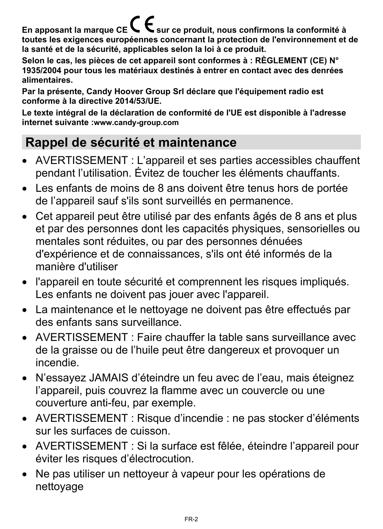 Selon le cas, les pièces de cet appareil sont conformes à : RÈGLEMENT (CE) N° 1935/2004 pour tous les matériaux destinés à entrer en contact avec des denrées alimentaires. Par la présente, Candy Hoover Group Srl déclare que l'équipement radio est conforme à la directive 2014/53/UE. Le texte intégral de la déclaration de conformité de l'UE est disponible à l'adresse internet suivante :www.candy-group.com
