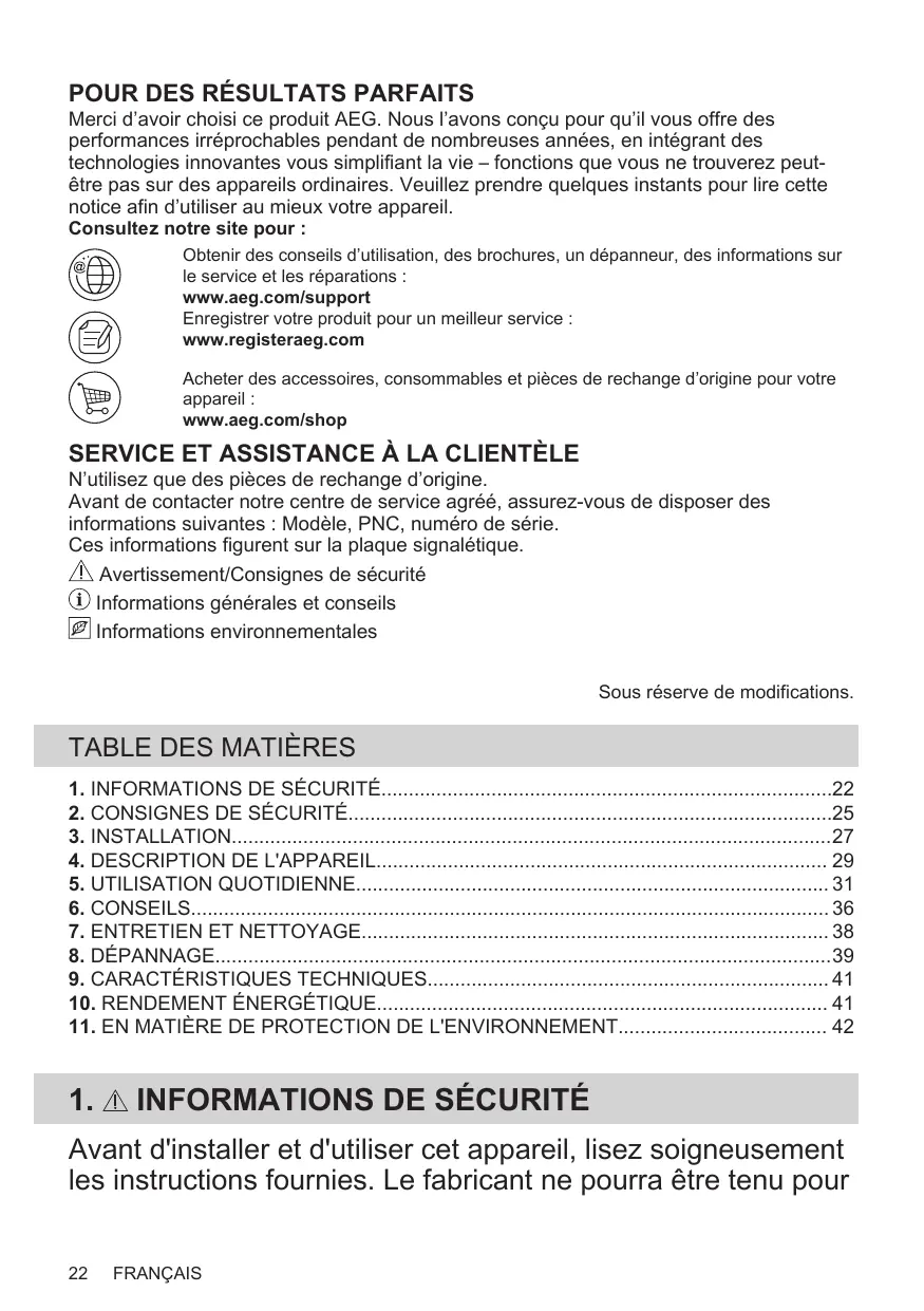 Obtenir des conseils d’utilisation, des brochures, un dépanneur, des informations sur le service et les réparations : www.aeg.com/support Enregistrer votre produit pour un meilleur service : www.registeraeg.com Acheter des accessoires, consommables et pièces de rechange d’origine pour votre appareil : www.aeg.com/shop