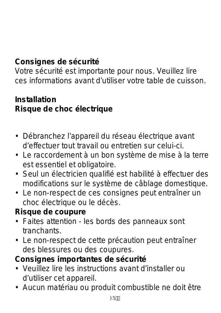 220-240V~ 220-240V~ 220-240V~ Ingresso Cavo di Consignes de sécurité Votre sécurité est importante pour nous. Veuillez lire ces informations avant d’utiliser votre table de cuisson. Installation Risque de choc électrique