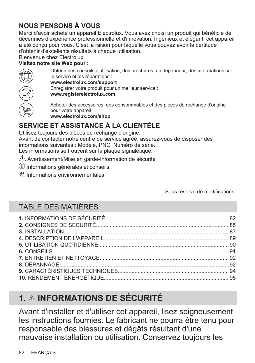 Merci d'avoir acheté un appareil Electrolux. Vous avez choisi un produit qui bénéficie de décennies d'expérience professionnelle et d'innovation. Ingénieux et élégant, cet appareil a été conçu pour vous. C'est la raison pour laquelle vous pouvez avoir la certitude d'obtenir d'excellents résultats à chaque utilisation. Bienvenue chez Electrolux. Visitez notre site Web pour : Obtenir des conseils d'utilisation, des brochures, un dépanneur, des informations sur le service et les réparations : www.electrolux.com/support Enregistrer votre produit pour un meilleur service : www.registerelectrolux.com Acheter des accessoires, des consommables et des pièces de rechange d'origine pour votre appareil : www.electrolux.com/shop