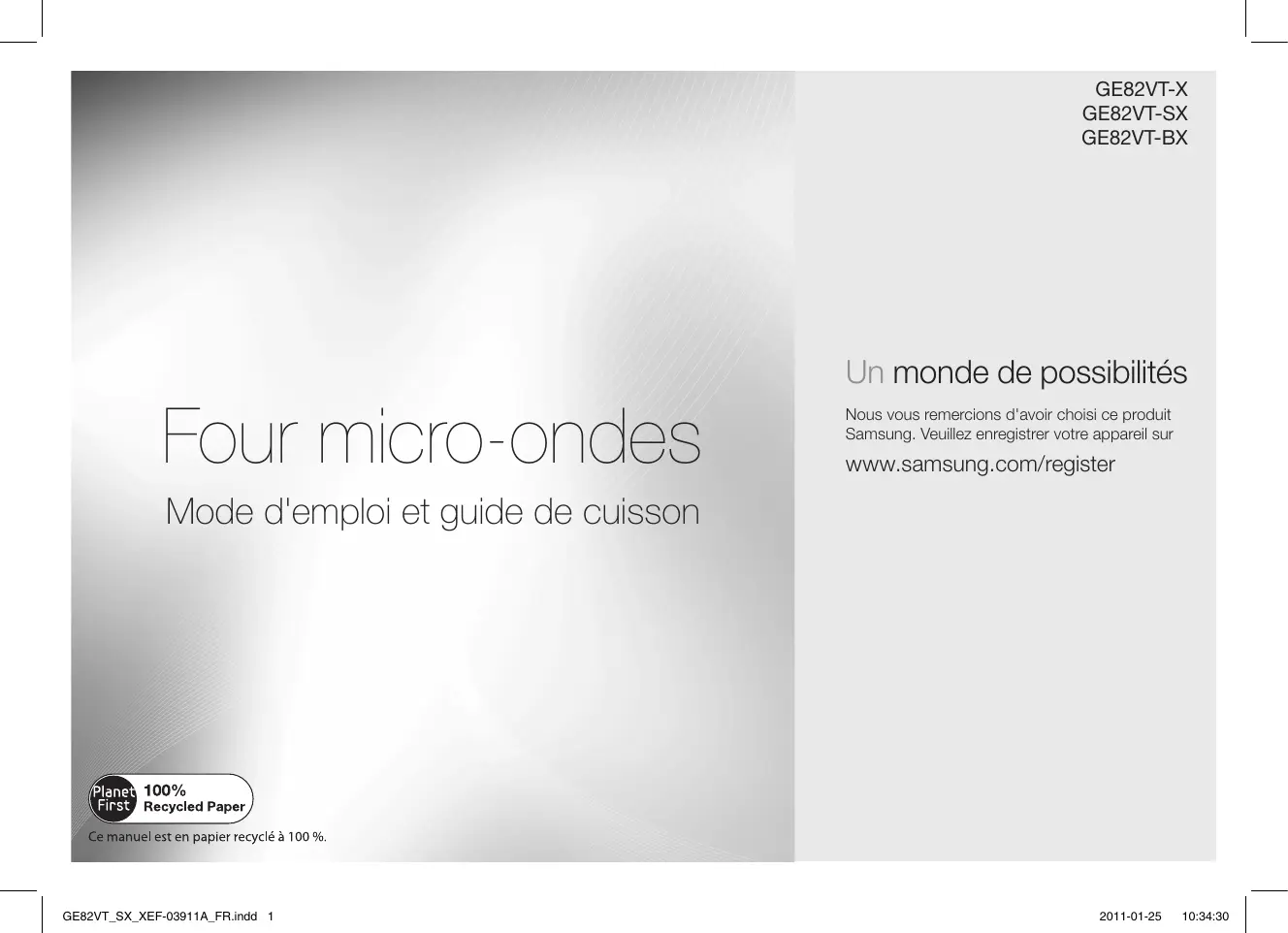 GE82VT-X GE82VT-SX GE82VT-BX Four micro-ondes Un monde de possibilités Nous vous remercions d'avoir choisi ce produit Samsung. Veuillez enregistrer votre appareil sur www.samsung.com/register Mode d'emploi et guide de cuisson GE82VT_SX_XEF-03911A_FR.indd 1 2011-01-25 10:34:30 FRANÇAIS SOMMAIRE