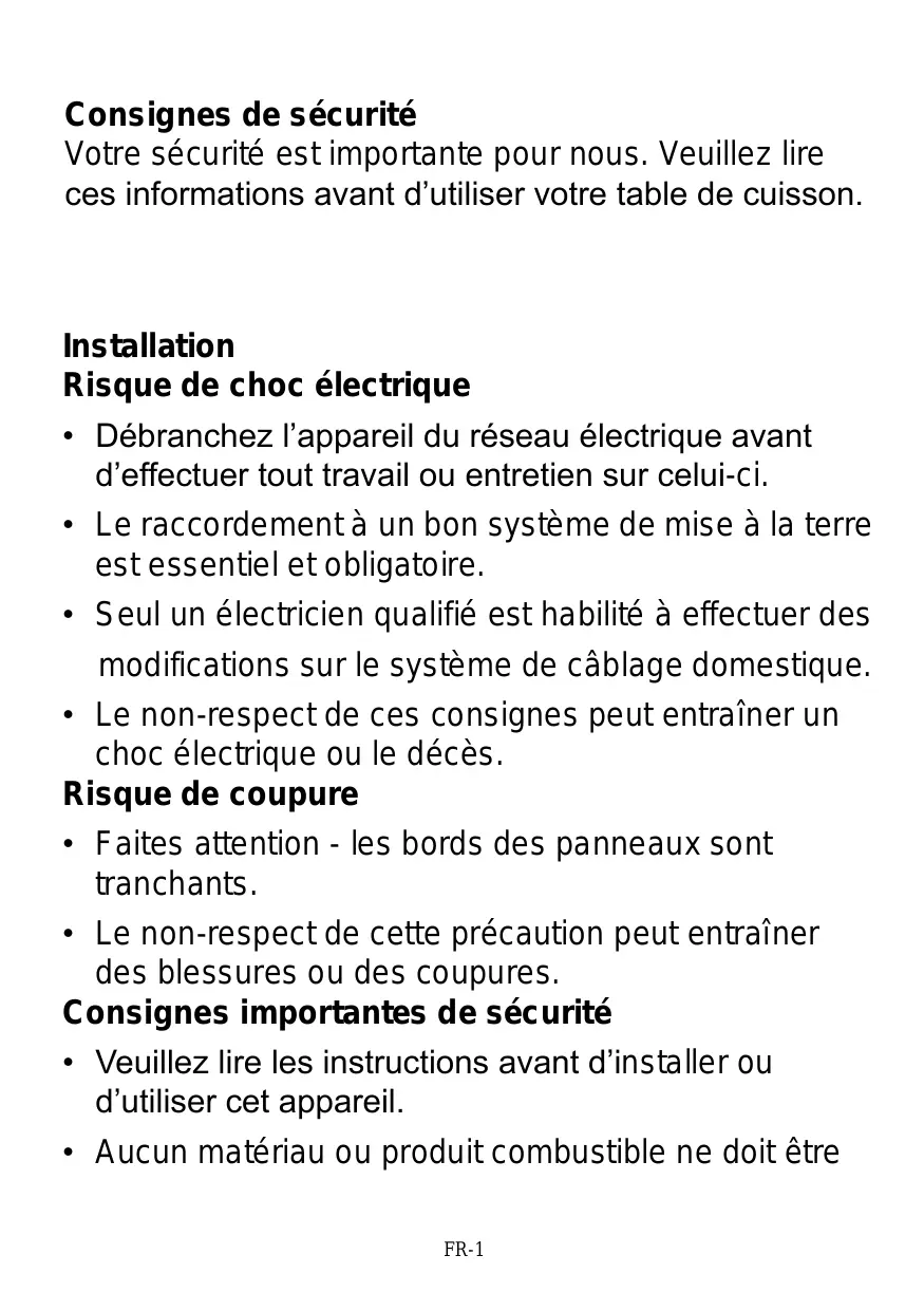 électromagnétique. Toutefois, les personnes porteuses de pacemakers ou d’autres implants électriques (tels que des pompes à insuline) doivent consulter leur médecin ou le fabricant de l’implant avant d'utiliser cet appareil afin de s'assurer que leurs implants ne seront pas affectés par le champs électromagnétique. Le non-respect de ces consignes peut entraîner le décès. Risque de surface chaude Pendant l’utilisation, les parties accessibles de cet appareil deviennent suffisamment chaudes pour causer des brûlures. Ne laissez pas votre corps, vos vêtements ou tout autre objet autre qu'un ustensile de cuisine approprié entrer en contact avec le verre à induction jusqu’à ce que la surface soit froide. Les objets métalliques tels que couteaux, fourchettes, cuillères et couvercles ne doivent pas être posés sur la surface de la table de cuisson, car ils peuvent devenir chauds. Tenir les enfants à l'écart. Les poignées des casseroles peuvent être chaudes au toucher. Vérifiez que les poignées des casseroles ne dépassent pas des autres foyers de cuisson qui sont en fonction. Tenir les poignées hors de portée des enfants. Le non-respect de ces consignes peut entraîner des brûlures ou un choc électrique. FR-3