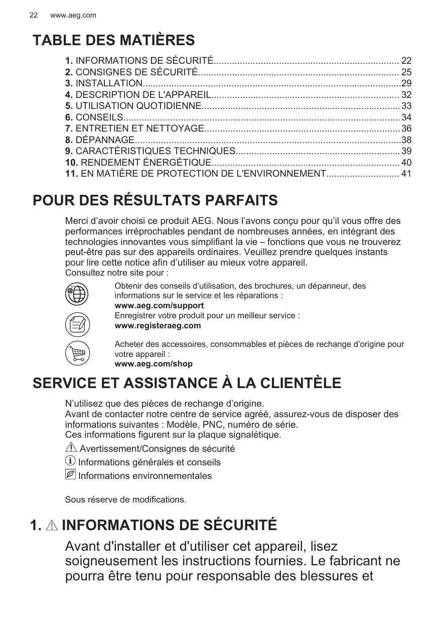 Obtenir des conseils d’utilisation, des brochures, un dépanneur, des informations sur le service et les réparations : www.aeg.com/support Enregistrer votre produit pour un meilleur service : www.registeraeg.com Acheter des accessoires, consommables et pièces de rechange d’origine pour votre appareil : www.aeg.com/shop