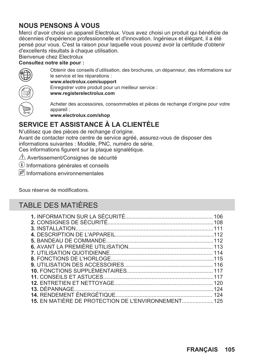 Merci d’avoir choisi un appareil Electrolux. Vous avez choisi un produit qui bénéficie de décennies d'expérience professionnelle et d'innovation. Ingénieux et élégant, il a été pensé pour vous. C'est la raison pour laquelle vous pouvez avoir la certitude d'obtenir d'excellents résultats à chaque utilisation. Bienvenue chez Electrolux Consultez notre site pour : Obtenir des conseils d’utilisation, des brochures, un dépanneur, des informations sur le service et les réparations : www.electrolux.com/support Enregistrer votre produit pour un meilleur service : www.registerelectrolux.com Acheter des accessoires, consommables et pièces de rechange d’origine pour votre appareil : www.electrolux.com/shop
