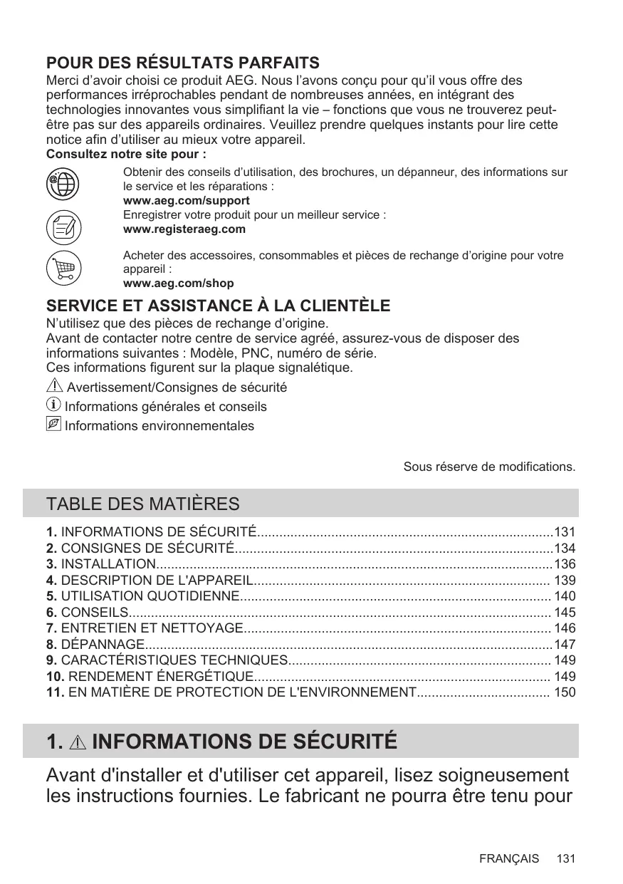 Merci d’avoir choisi ce produit AEG. Nous l’avons conçu pour qu’il vous offre des performances irréprochables pendant de nombreuses années, en intégrant des technologies innovantes vous simplifiant la vie – fonctions que vous ne trouverez peutêtre pas sur des appareils ordinaires. Veuillez prendre quelques instants pour lire cette notice afin d’utiliser au mieux votre appareil.