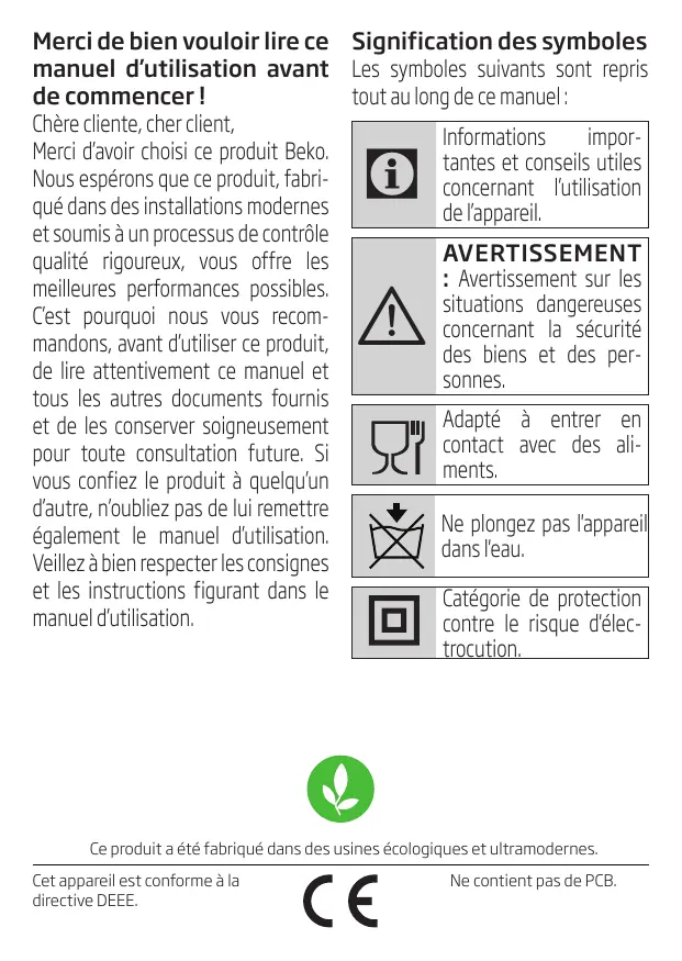 Merci de bien vouloir lire ce Signification des symboles manuel d’utilisation avant Les symboles suivants sont repris de commencer ! tout au long de ce manuel : Chère cliente, cher client, Informations imporMerci d’avoir choisi ce produit Beko. tantes et conseils utiles Nous espérons que ce produit, fabriconcernant l’utilisation qué dans des installations modernes de l’appareil. et soumis à un processus de contrôle AVERTISSEMENT qualité rigoureux, vous offre les : Avertissement sur les meilleures performances possibles. situations dangereuses C’est pourquoi nous vous recomconcernant la sécurité mandons, avant d’utiliser ce produit, des biens et des perde lire attentivement ce manuel et sonnes. tous les autres documents fournis Adapté à entrer en et de les conserver soigneusement contact avec des alipour toute consultation future. Si ments. vous confiez le produit à quelqu’un d’autre, n’oubliez pas de lui remettre Ne plongez pas l'appareil également le manuel d’utilisation. dans l'eau. Veillez à bien respecter les consignes et les instructions figurant dans le Catégorie de protection manuel d’utilisation. contre le risque d'électrocution.