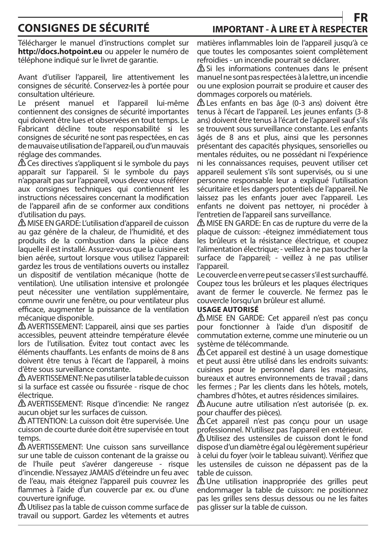 Le présent manuel et l’appareil lui-même Les enfants en bas âge (0-3 ans) doivent être contiennent des consignes de sécurité importantes tenus à l’écart de l’appareil. Les jeunes enfants (3-8 qui doivent être lues et observées en tout temps. Le ans) doivent être tenus à l’écart de l’appareil sauf s’ils Fabricant décline toute responsabilité si les se trouvent sous surveillance constante. Les enfants consignes de sécurité ne sont pas respectées, en cas âgés de 8 ans et plus, ainsi que les personnes de mauvaise utilisation de l’appareil, ou d’un mauvais présentant des capacités physiques, sensorielles ou réglage des commandes. mentales réduites, ou ne possédant ni l’expérience Ces directives s’appliquent si le symbole du pays ni les connaissances requises, peuvent utiliser cet apparaît sur l’appareil. Si le symbole du pays appareil seulement s’ils sont supervisés, ou si une n’apparaît pas sur l’appareil, vous devez vous référer personne responsable leur a expliqué l’utilisation aux consignes techniques qui contiennent les sécuritaire et les dangers potentiels de l’appareil. Ne instructions nécessaires concernant la modification laissez pas les enfants jouer avec l’appareil. Les de l’appareil afin de se conformer aux conditions enfants ne doivent pas nettoyer, ni procéder à l’entretien de l’appareil sans surveillance. d’utilisation du pays. MISE EN GARDE: L’utilisation d’appareil de cuisson MISE EN GARDE: En cas de rupture du verre de la au gaz génère de la chaleur, de l’humidité, et des plaque de cuisson: -éteignez immédiatement tous produits de la combustion dans la pièce dans les brûleurs et la résistance électrique, et coupez laquelle il est installé. Assurez-vous que la cuisine est l’alimentation électrique; - veillez à ne pas toucher la bien aérée, surtout lorsque vous utilisez l’appareil: surface de l’appareil; - veillez à ne pas utiliser gardez les trous de ventilations ouverts ou installez l’appareil. un dispositif de ventilation mécanique (hotte de Le couvercle en verre peut se casser s’il est surchauffé. ventilation). Une utilisation intensive et prolongée Coupez tous les brûleurs et les plaques électriques peut nécessiter une ventilation supplémentaire, avant de fermer le couvercle. Ne fermez pas le comme ouvrir une fenêtre, ou pour ventilateur plus couvercle lorsqu’un brûleur est allumé. efficace, augmenter la puissance de la ventilation USAGE AUTORISÉ mécanique disponible. MISE EN GARDE: Cet appareil n’est pas conçu AVERTISSEMENT: L’appareil, ainsi que ses parties pour fonctionner à l’aide d’un dispositif de accessibles, peuvent atteindre température élevée commutation externe, comme une minuterie ou un lors de l’utilisation. Évitez tout contact avec les système de télécommande. éléments chauffants. Les enfants de moins de 8 ans Cet appareil est destiné à un usage domestique doivent être tenus à l’écart de l’appareil, à moins et peut aussi être utilisé dans les endroits suivants: d’être sous surveillance constante. cuisines pour le personnel dans les magasins, AVERTISSEMENT: Ne pas utiliser la table de cuisson bureaux et autres environnements de travail ; dans si la surface est cassée ou fissurée - risque de choc les fermes ; Par les clients dans les hôtels, motels, électrique. chambres d’hôtes, et autres résidences similaires. AVERTISSEMENT: Risque d’incendie: Ne rangez Aucune autre utilisation n’est autorisée (p. ex. aucun objet sur les surfaces de cuisson. pour chauffer des pièces). ATTENTION: La cuisson doit être supervisée. Une Cet appareil n’est pas conçu pour un usage cuisson de courte durée doit être supervisée en tout professionnel. N’utilisez pas l’appareil en extérieur. temps. Utilisez des ustensiles de cuisson dont le fond AVERTISSEMENT: Une cuisson sans surveillance dispose d’un diamètre égal ou légèrement supérieur sur une table de cuisson contenant de la graisse ou à celui du foyer (voir le tableau suivant). Vérifiez que de l’huile peut s’avérer dangereuse - risque les ustensiles de cuisson ne dépassent pas de la d’incendie. N’essayez JAMAIS d’éteindre un feu avec table de cuisson. de l’eau, mais éteignez l’appareil puis couvrez les Une utilisation inappropriée des grilles peut flammes à l’aide d’un couvercle par ex. ou d’une endommager la table de cuisson: ne positionnez couverture ignifuge. pas les grilles sens dessus dessous ou ne les faites Utilisez pas la table de cuisson comme surface de pas glisser sur la table de cuisson. travail ou support. Gardez les vêtements et autres