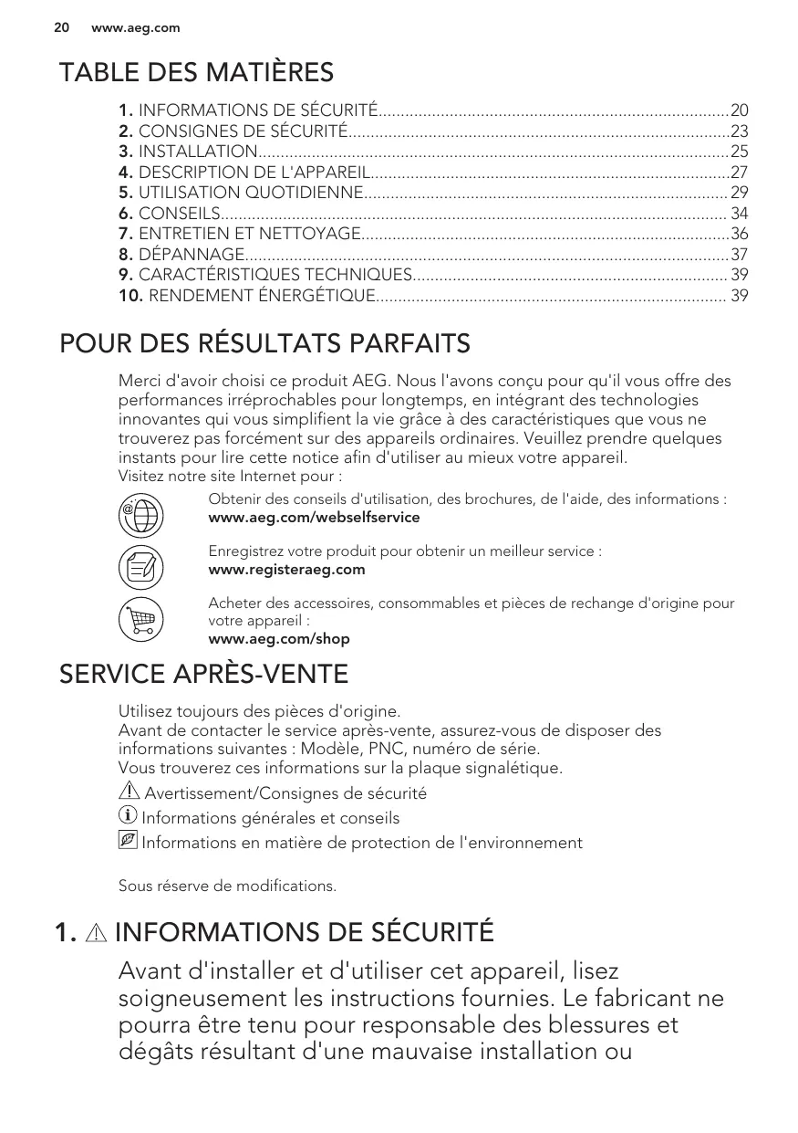 | Pièces détachées et réparabilité | Disponibilité des pièces détachées via le service après-vente AEG |