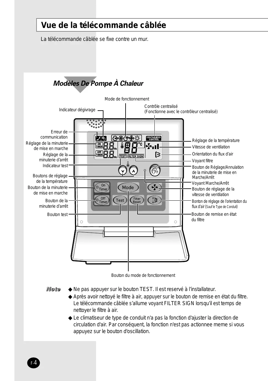 F-3 Vue de la télécommande câblée La télécommande câblée se fixe contre un mur. Modèles De Pompe À Chaleur Mode de fonctionnement Indicateur dégivrage Contrôle centralisé (Fonctionne avec le contrôleur centralisé) Erreur de communication Réglage de la minuterie de mise en marche Réglage de la minuterie d’arrêt Indicateur test Réglage de la température Vitesse de ventilation Orientation du flux d’air Voyant filtre Bouton de Réglage/Annulation de la minuterie de mise en Marche/Arrêt Voyant Marche/Arrêt Bouton de réglage de la vitesse de ventilation Bonton de réglage de l’orientation du flux d’air (Sauf le Type de Conduit) Boutons de réglage de la température Bouton de la minuterie de mise en marche Bouton de la minuterie d’arrêt Bouton de remise en état du filtre Bouton test Bouton du mode de fonctionnement Note F-4 ◆ Ne pas appuyer sur le bouton TEST. Il est reservé à l’installateur. ◆ Après avoir nettoyé le filtre à air, appuyer sur le bouton de remise en état du filtre. Le télécommande câblée s’allume voyant FILTER SIGN lorsqu’il est temps de nettoyer le filtre à air. ◆ Le climatiseur de type de conduit n'a pas la fonction d'ajuster la direction de circulation d'air. Par conséquent, la fonction n'est pas actionnee meme si vous appuyez sur le bouton d'oscillation. Modèles de refroidissement unique Mode de fonctionnement FRANÇAIS Contrôle centralisé (Fonctionne avec le contrôleur centralisé) Erreur de communication Réglage de la température Vitesse de ventilation Réglage de la minuterie de mise en marche Réglage de la minuterie d’arrêt Indicatore test Orientation du flux d’air Voyant filtre Bouton de Réglage/Annulation de la minuterie de mise en Marche/Arrêt Tasti regolazione temperatura Bouton de la minuterie de mise en marche Voyant Marche/Arrêt Bouton de réglage de la vitesse de ventilation Bouton de la minuterie d’arrêt Bonton de réglage de l’orientation du flux d’air (Sauf le Type de Conduit) Bouton test Bouton de remise en état du filtre Bouton du mode de fonctionnement Note ◆ Ne pas appuyer sur le bouton TEST. Il est reservé à l’installateur. ◆ Après avoir nettoyé le filtre à air, appuyer sur le bouton de remise en état du filtre. Le télécommande câblée s’allume voyant FILTER SIGN lorsqu’il est temps de nettoyer le filtre à air. ◆ Le climatiseur de type de conduit n'a pas la fonction d'ajuster la direction de circulation d'air. Par conséquent, la fonction n'est pas actionnee meme si vous appuyez sur le bouton d'oscillation. F-5 Avant-propos Vous venez d’acheter une télécommande câblée et elle a été installé par un expert. Votre mode d’emploi contient des informations beaucoup plus importantes sur l’utilisation de votre télécommande câblée. Le lire attentivement afin de profiter pleinement de toutes les fonctions de l’appareil. Le mode d’emploi est organisé comme suit. Les illustrations des procédures utilisent les trois symboles suivants : APPUYER F-6 POUSSER