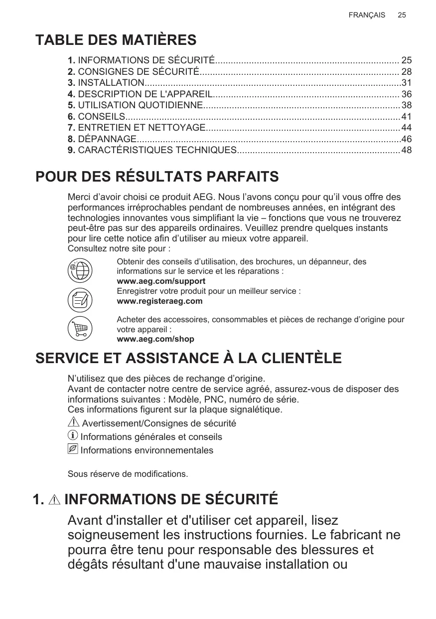 | Pièces détachées et réparabilité | Disponibilité de pièces de rechange via le service après-vente AEG |