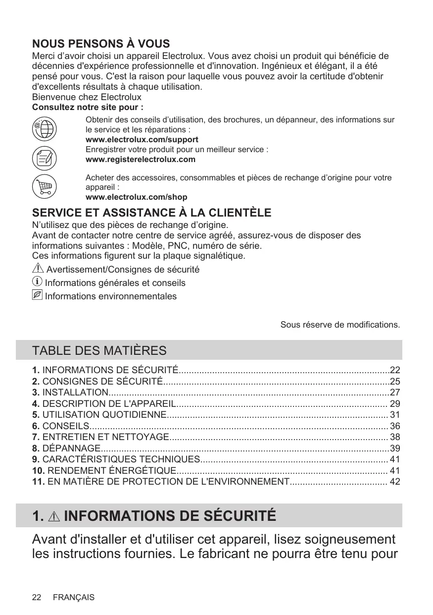 N’utilisez que des pièces de rechange d’origine. Avant de contacter notre centre de service agréé, assurez-vous de disposer des informations suivantes : Modèle, PNC, numéro de série. Ces informations figurent sur la plaque signalétique. Avertissement/Consignes de sécurité Informations générales et conseils Informations environnementales Sous réserve de modifications. Avant d'installer et d'utiliser cet appareil, lisez soigneusement les instructions fournies. Le fabricant ne pourra être tenu pour