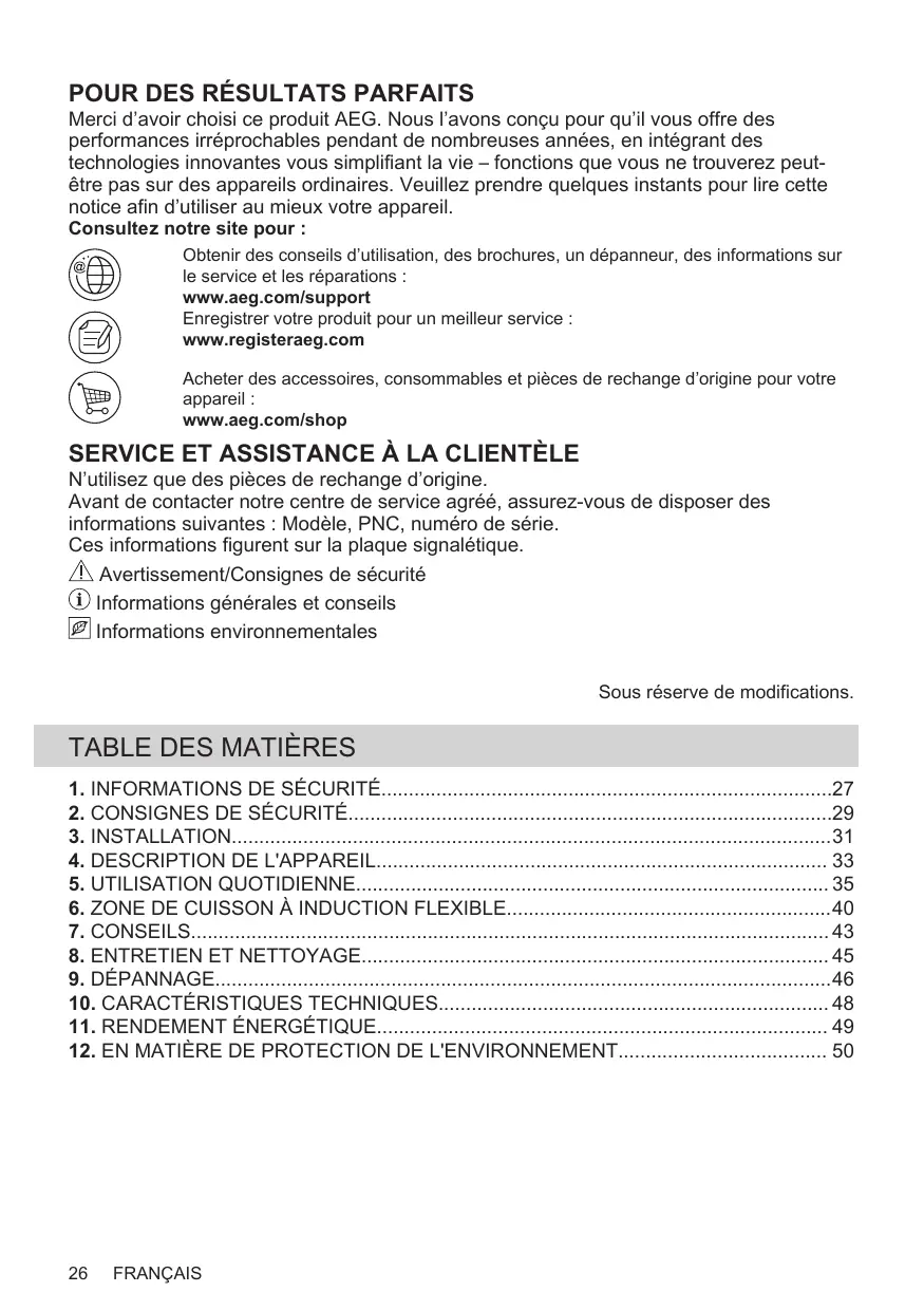 Merci d’avoir choisi ce produit AEG. Nous l’avons conçu pour qu’il vous offre des performances irréprochables pendant de nombreuses années, en intégrant des technologies innovantes vous simplifiant la vie – fonctions que vous ne trouverez peutêtre pas sur des appareils ordinaires. Veuillez prendre quelques instants pour lire cette notice afin d’utiliser au mieux votre appareil. Consultez notre site pour : Obtenir des conseils d’utilisation, des brochures, un dépanneur, des informations sur le service et les réparations : www.aeg.com/support Enregistrer votre produit pour un meilleur service : www.registeraeg.com Acheter des accessoires, consommables et pièces de rechange d’origine pour votre appareil : www.aeg.com/shop