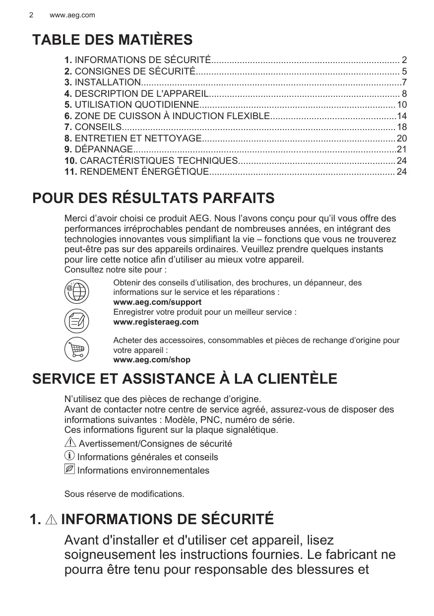 TABLE DES MATIÈRES 1. INFORMATIONS DE SÉCURITÉ 2 2. CONSIGNES DE SÉCURITÉ 5 3. INSTALLATION7 4. DESCRIPTION DE L'APPAREIL 8 5. UTILISATION QUOTIDIENNE 10 6. ZONE DE CUISSON À INDUCTION FLEXIBLE14 7. CONSEILS 18 8. ENTRETIEN ET NETTOYAGE 20 9. DÉPANNAGE21 10. CARACTÉRISTIQUES TECHNIQUES 24 11. RENDEMENT ÉNERGÉTIQUE 24