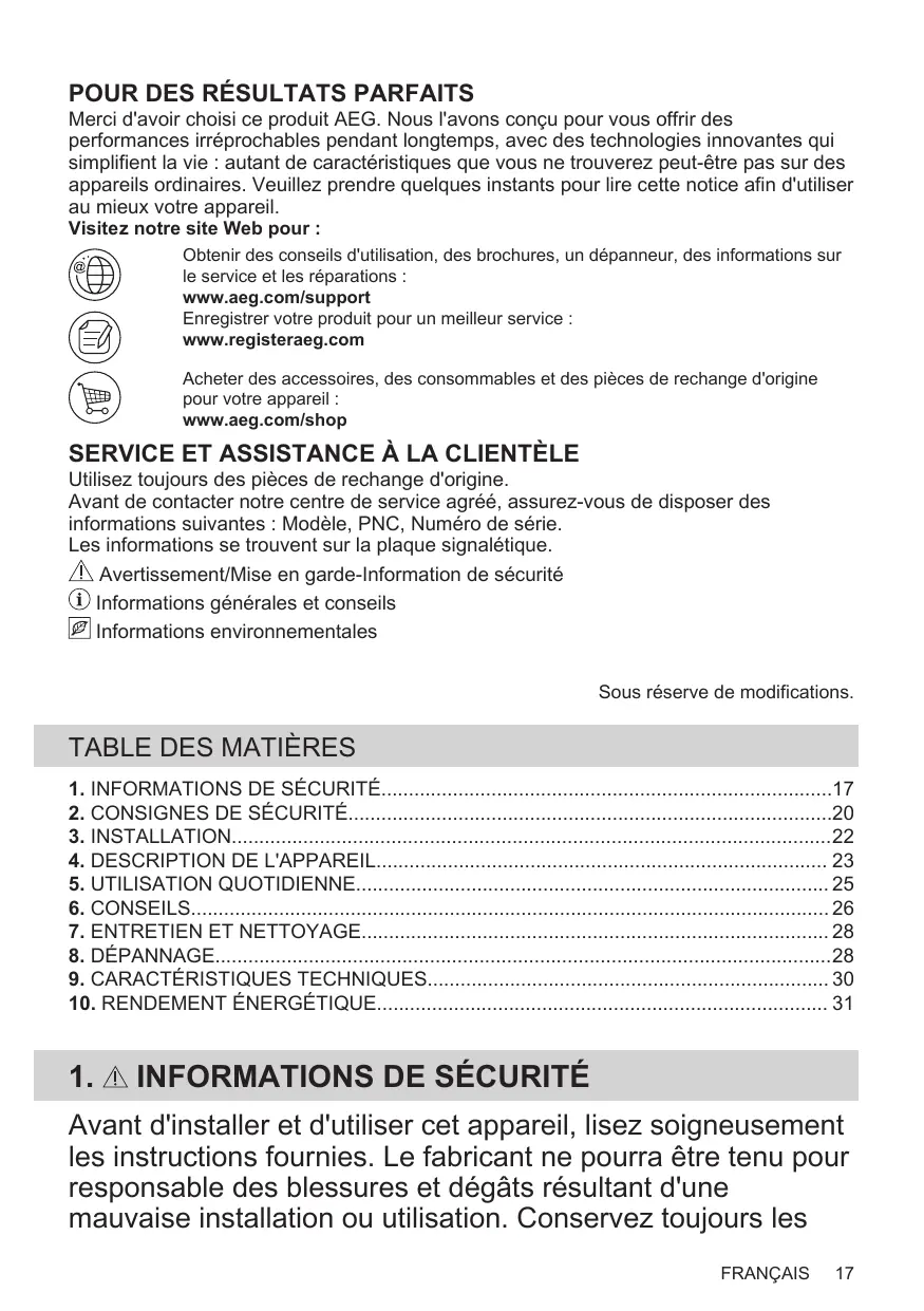 Merci d'avoir choisi ce produit AEG. Nous l'avons conçu pour vous offrir des performances irréprochables pendant longtemps, avec des technologies innovantes qui simplifient la vie : autant de caractéristiques que vous ne trouverez peut-être pas sur des appareils ordinaires. Veuillez prendre quelques instants pour lire cette notice afin d'utiliser au mieux votre appareil. Visitez notre site Web pour : Obtenir des conseils d'utilisation, des brochures, un dépanneur, des informations sur le service et les réparations : www.aeg.com/support Enregistrer votre produit pour un meilleur service : www.registeraeg.com Acheter des accessoires, des consommables et des pièces de rechange d'origine pour votre appareil : www.aeg.com/shop