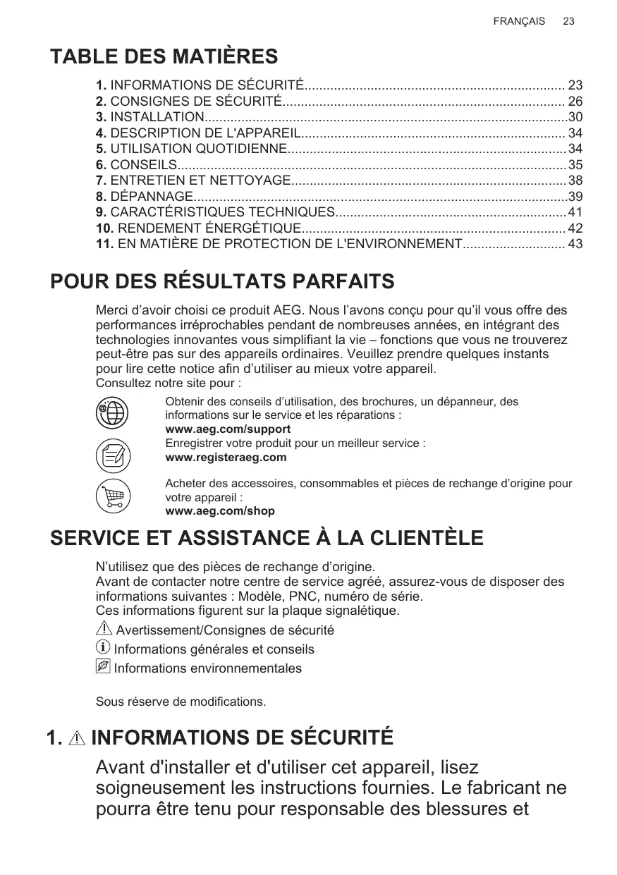 Merci d’avoir choisi ce produit AEG. Nous l’avons conçu pour qu’il vous offre des performances irréprochables pendant de nombreuses années, en intégrant des technologies innovantes vous simplifiant la vie – fonctions que vous ne trouverez peut-être pas sur des appareils ordinaires. Veuillez prendre quelques instants pour lire cette notice afin d’utiliser au mieux votre appareil. Consultez notre site pour : Obtenir des conseils d’utilisation, des brochures, un dépanneur, des informations sur le service et les réparations : www.aeg.com/support Enregistrer votre produit pour un meilleur service : www.registeraeg.com Acheter des accessoires, consommables et pièces de rechange d’origine pour votre appareil : www.aeg.com/shop