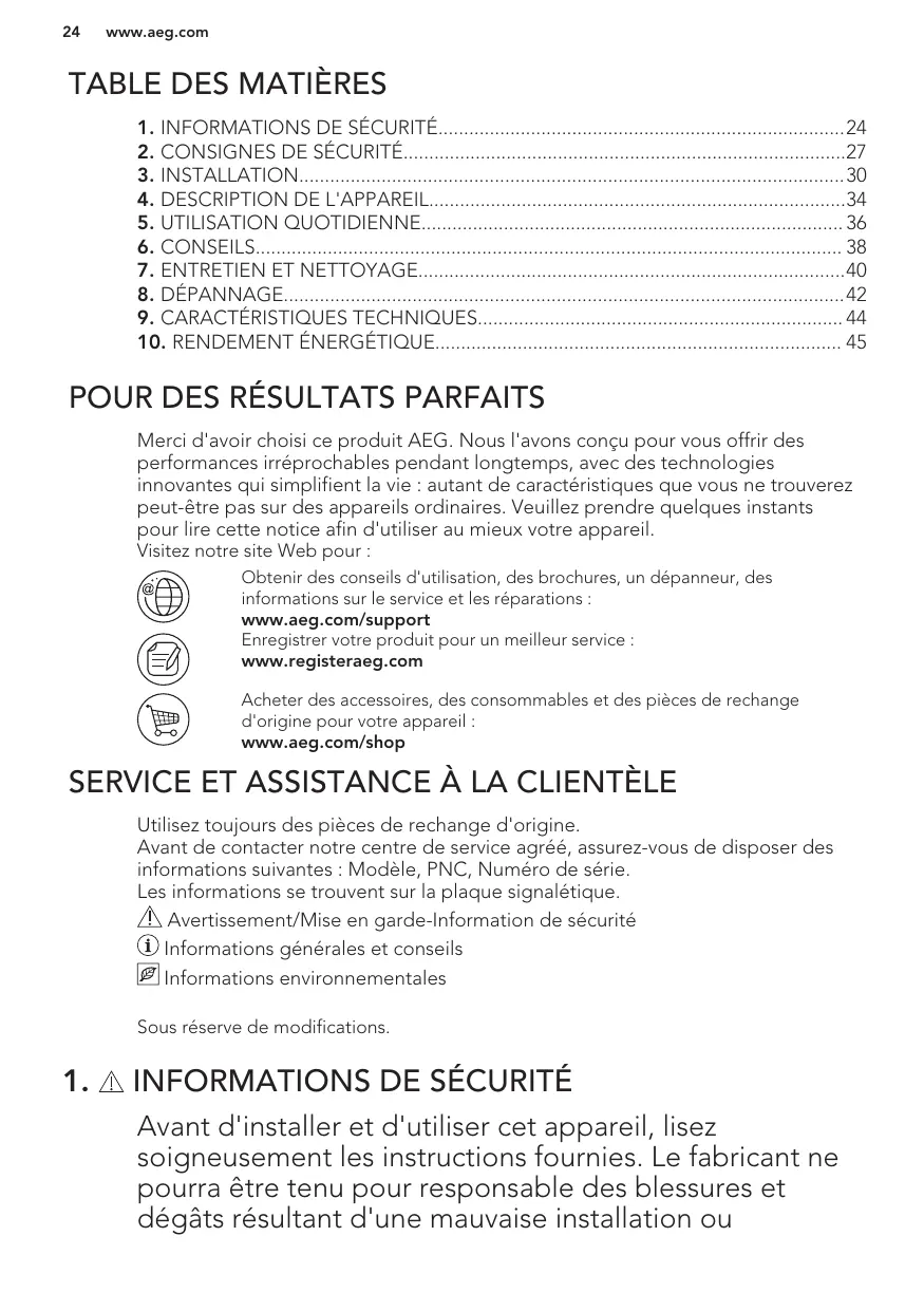 4. DESCRIPTION DE L'APPAREIL34 5. UTILISATION QUOTIDIENNE 36 6. CONSEILS 38 7. ENTRETIEN ET NETTOYAGE40 8. DÉPANNAGE42 Acheter des accessoires, des consommables et des pièces de rechange d'origine pour votre appareil : www.aeg.com/shop