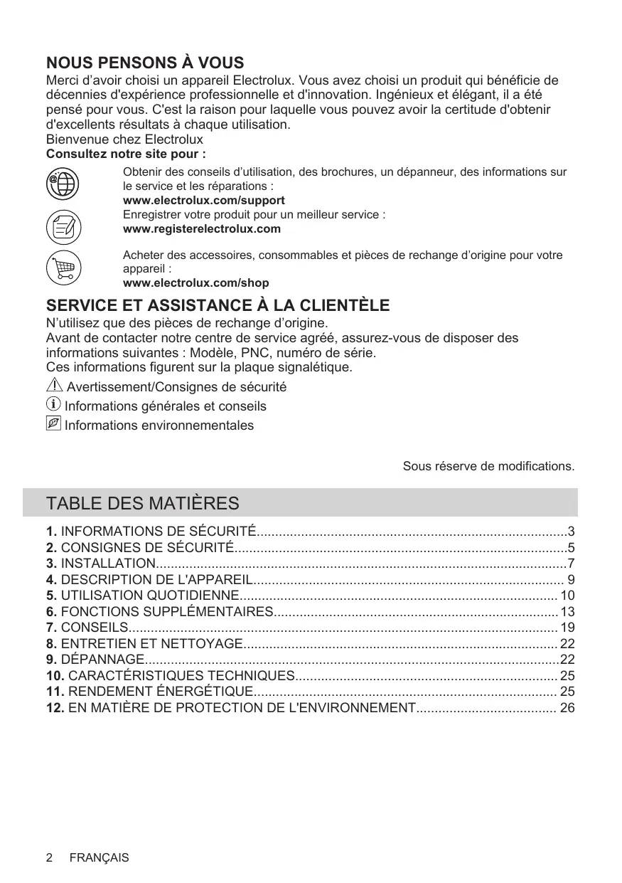 Merci d’avoir choisi un appareil Electrolux. Vous avez choisi un produit qui bénéficie de décennies d'expérience professionnelle et d'innovation. Ingénieux et élégant, il a été pensé pour vous. C'est la raison pour laquelle vous pouvez avoir la certitude d'obtenir d'excellents résultats à chaque utilisation. Bienvenue chez Electrolux Consultez notre site pour : Obtenir des conseils d’utilisation, des brochures, un dépanneur, des informations sur le service et les réparations : www.electrolux.com/support Enregistrer votre produit pour un meilleur service : www.registerelectrolux.com Acheter des accessoires, consommables et pièces de rechange d’origine pour votre appareil : www.electrolux.com/shop