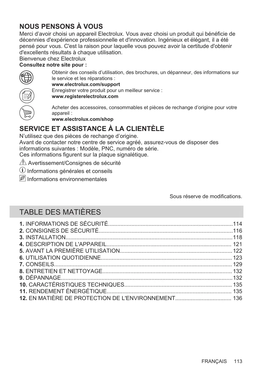 Avant de contacter notre centre de service agréé, assurez-vous de disposer des informations suivantes : Modèle, PNC, numéro de série. Ces informations figurent sur la plaque signalétique. Avertissement/Consignes de sécurité Informations générales et conseils Informations environnementales Sous réserve de modifications.