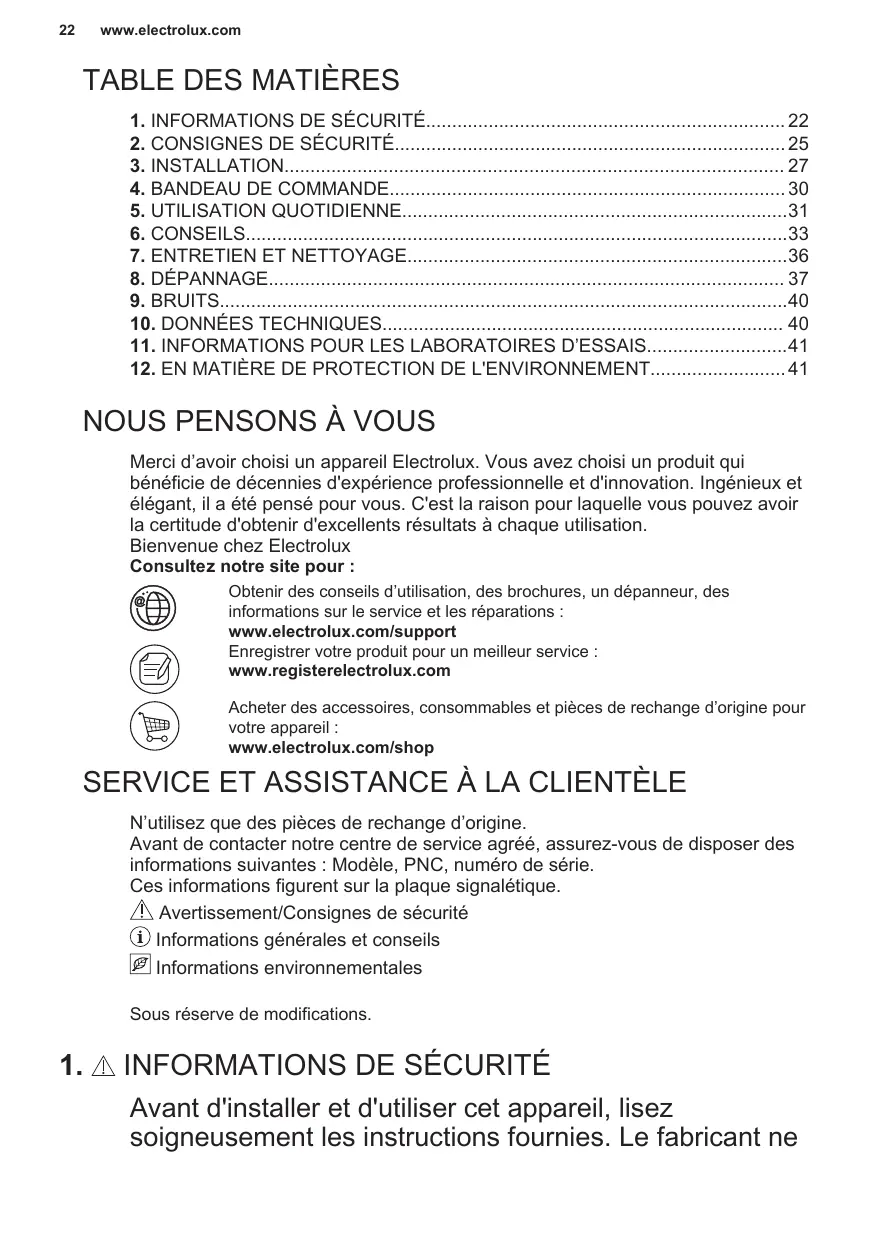 Merci d’avoir choisi un appareil Electrolux. Vous avez choisi un produit qui bénéficie de décennies d'expérience professionnelle et d'innovation. Ingénieux et élégant, il a été pensé pour vous. C'est la raison pour laquelle vous pouvez avoir la certitude d'obtenir d'excellents résultats à chaque utilisation. Bienvenue chez Electrolux Consultez notre site pour : Obtenir des conseils d’utilisation, des brochures, un dépanneur, des informations sur le service et les réparations : www.electrolux.com/support Enregistrer votre produit pour un meilleur service : www.registerelectrolux.com Acheter des accessoires, consommables et pièces de rechange d’origine pour votre appareil : www.electrolux.com/shop