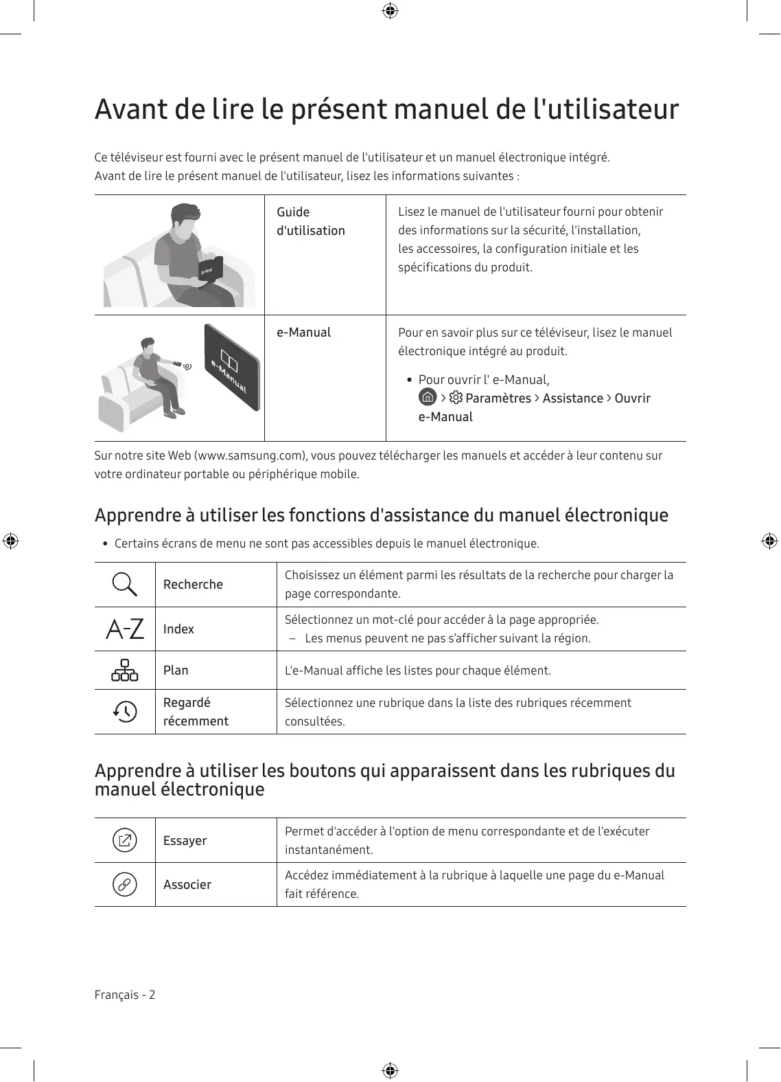 Avant de lire le présent manuel de l'utilisateur Ce téléviseur est fourni avec le présent manuel de l'utilisateur et un manuel électronique intégré. Avant de lire le présent manuel de l'utilisateur, lisez les informations suivantes : Guide d'utilisation Lisez le manuel de l'utilisateur fourni pour obtenir des informations sur la sécurité, l'installation, les accessoires, la configuration initiale et les spécifications du produit. e-Manual Pour en savoir plus sur ce téléviseur, lisez le manuel électronique intégré au produit.