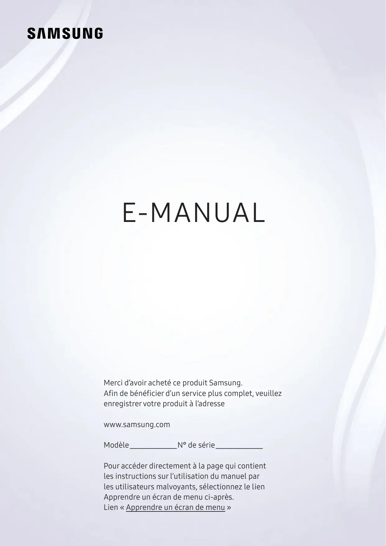 E-MANUAL Merci d’avoir acheté ce produit Samsung. Afin de bénéficier d’un service plus complet, veuillez enregistrer votre produit à l’adresse www.samsung.com Modèle__________________N° de série__________________ Pour accéder directement à la page qui contient les instructions sur l’utilisation du manuel par les utilisateurs malvoyants, sélectionnez le lien Apprendre un écran de menu ci-après. Lien « Apprendre un écran de menu » Sommaire Guides de démarrage L'utilisation du Smart Hub Mise à jour du logiciel du téléviseur