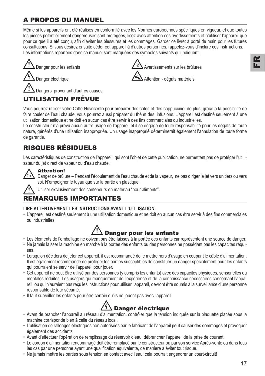 Vous pourrez utiliser votre Caffé Novecento pour préparer des cafés et des cappuccino; de plus, grâce à la possibilité de faire couler de l’eau chaude, vous pourrez aussi préparer du thé et des infusions. L’appareil est destiné seulement à une utilisation domestique et ne doit en aucun cas être servir à des ins commerciales ou industrielles. Le constructeur n’a prévu aucun autre usage de l’appareil et il se dégage de toute responsabilité pour les dégats de toute nature, générés d’une utilisation inappropriée. Un usage inapproprié déterminerait également l’annulation de toute forme de garantie.