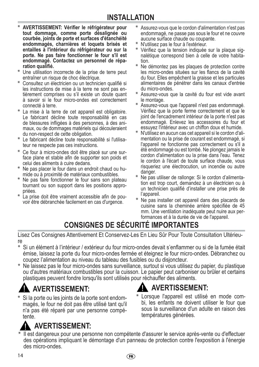 * Si la porte ou les joints de la porte sont endommagés, le four ne doit pas être utilisé tant qu'il n'a pas été réparé par une personne compétente.