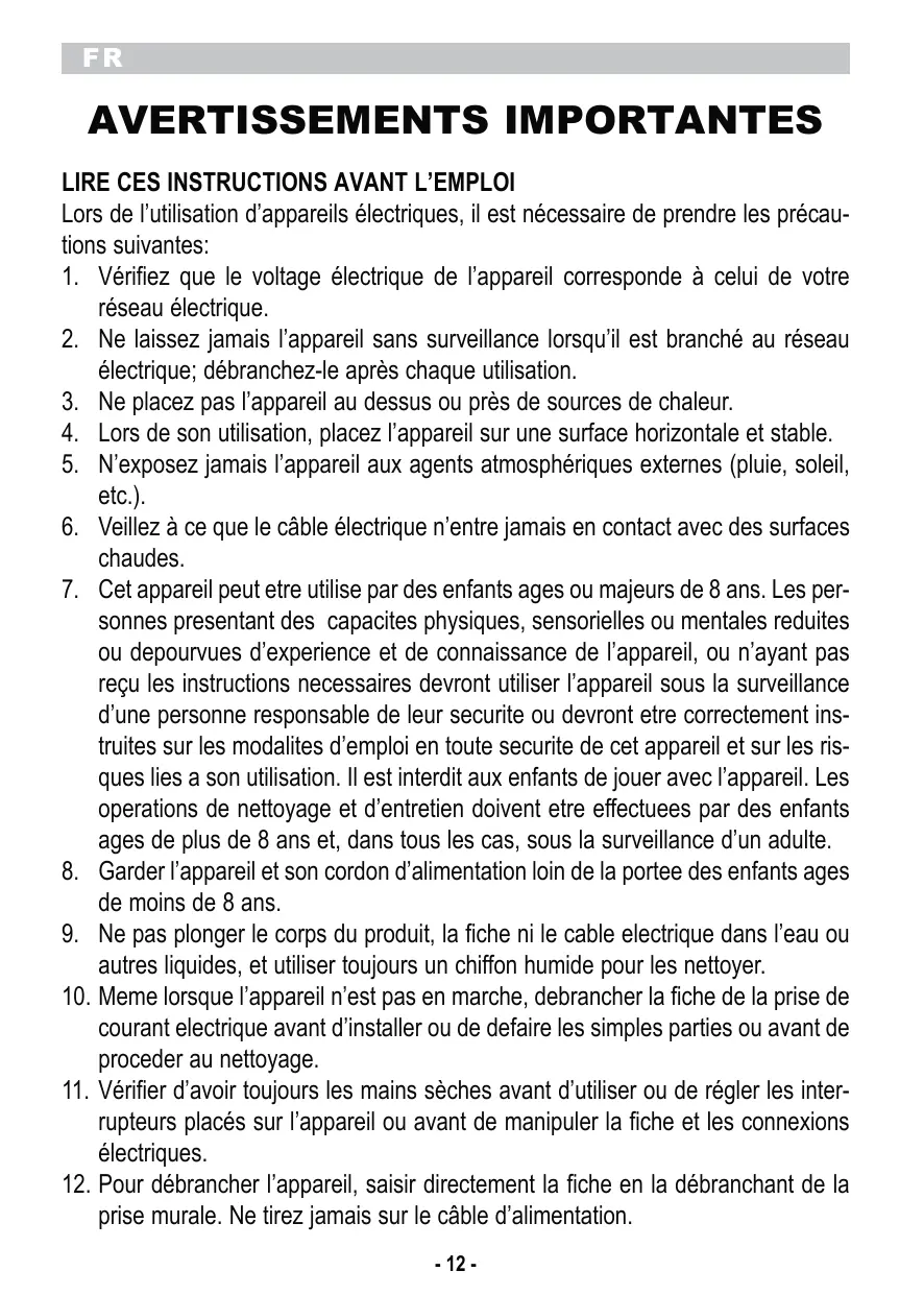 AVERTISSEMENTS IMPORTANTES LIRE CES INSTRUCTIONS AVANT L’EMPLOI Lors de l’utilisation d’appareils électriques, il est nécessaire de prendre les précautions suivantes: 1. Vérifiez que le voltage électrique de l’appareil corresponde à celui de votre réseau électrique. 2. Ne laissez jamais l’appareil sans surveillance lorsqu’il est branché au réseau électrique; débranchez-le après chaque utilisation. 3. Ne placez pas l’appareil au dessus ou près de sources de chaleur. 4. Lors de son utilisation, placez l’appareil sur une surface horizontale et stable. 5. N’exposez jamais l’appareil aux agents atmosphériques externes (pluie, soleil, etc.). 6. Veillez à ce que le câble électrique n’entre jamais en contact avec des surfaces chaudes. 7. Cet appareil peut etre utilise par des enfants ages ou majeurs de 8 ans. Les personnes presentant des capacites physiques, sensorielles ou mentales reduites ou depourvues d’experience et de connaissance de l’appareil, ou n’ayant pas reçu les instructions necessaires devront utiliser l’appareil sous la surveillance d’une personne responsable de leur securite ou devront etre correctement instruites sur les modalites d’emploi en toute securite de cet appareil et sur les risques lies a son utilisation. Il est interdit aux enfants de jouer avec l’appareil. Les operations de nettoyage et d’entretien doivent etre effectuees par des enfants ages de plus de 8 ans et, dans tous les cas, sous la surveillance d’un adulte. 8. Garder l’appareil et son cordon d’alimentation loin de la portee des enfants ages de moins de 8 ans. 9. Ne pas plonger le corps du produit, la fiche ni le cable electrique dans l’eau ou autres liquides, et utiliser toujours un chiffon humide pour les nettoyer. 10. Meme lorsque l’appareil n’est pas en marche, debrancher la fiche de la prise de courant electrique avant d’installer ou de defaire les simples parties ou avant de proceder au nettoyage. 11. Vérifier d’avoir toujours les mains sèches avant d’utiliser ou de régler les interrupteurs placés sur l’appareil ou avant de manipuler la fiche et les connexions électriques. 12. Pour débrancher l’appareil, saisir directement la fiche en la débranchant de la prise murale. Ne tirez jamais sur le câble d’alimentation. - 12 -